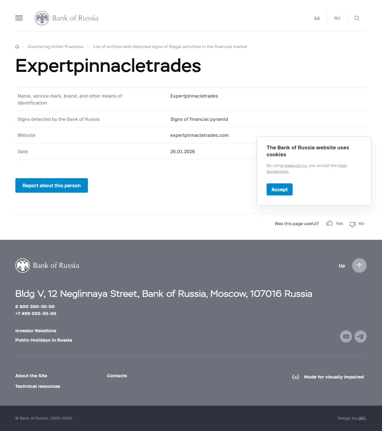 금융 시장에서 불법 활동 징후가 감지된 개체 목록 Expertpinnacletrades.