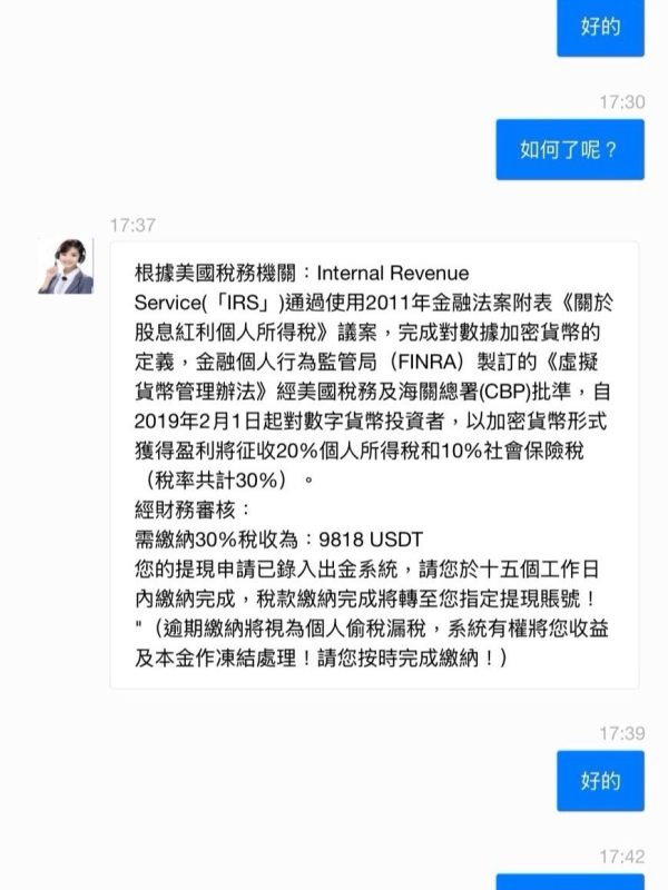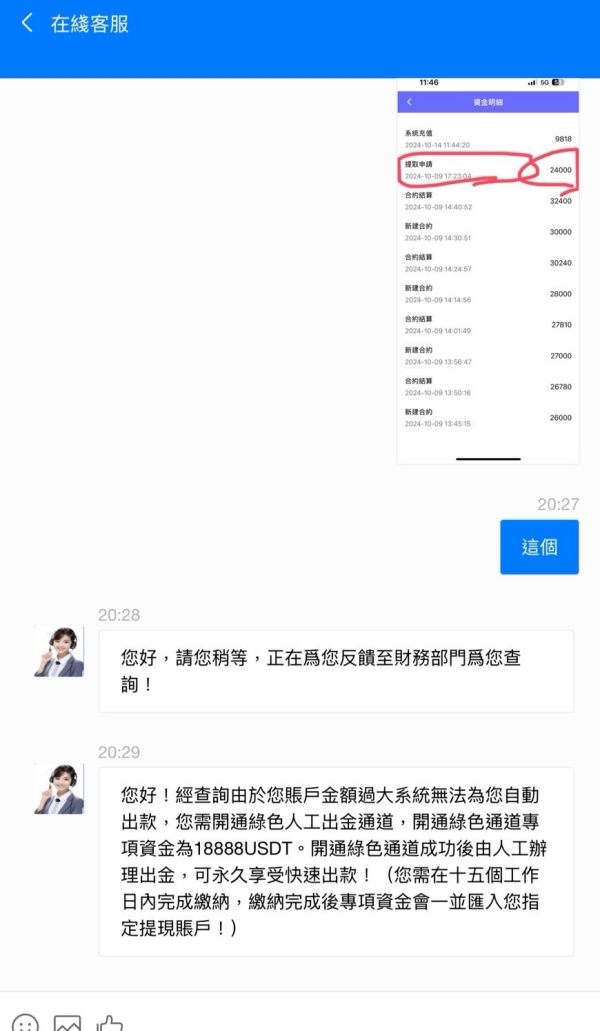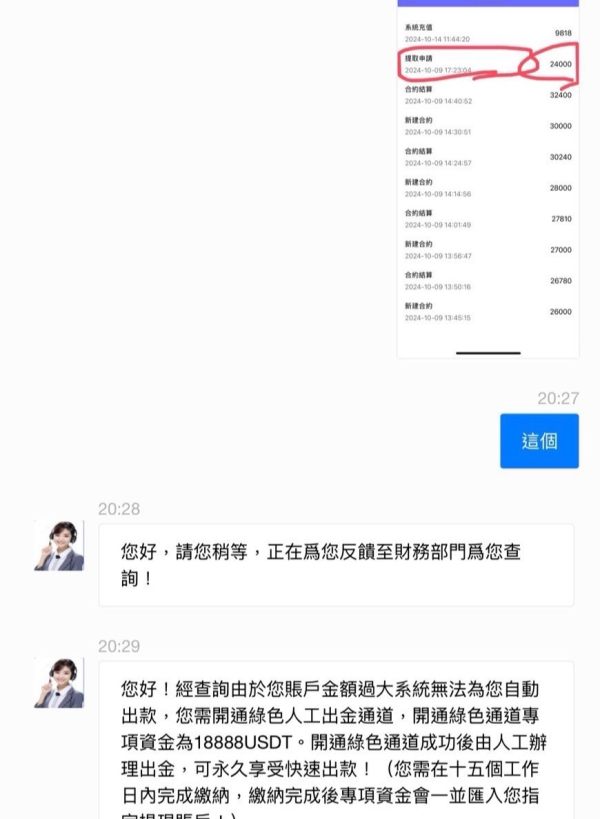 就我同事看我不好過媽媽9月10號又出了重大車禍…到現在為止都還在醫院…然後就說他跟朋友做投資賺了很多錢…一開始…我只是應付他們所以用一萬台幣去做..之後我說我不要做了開始各式各樣的騷擾跟威脅..後來強迫我一定要做不然就要把我的私密照片跟資訊放出去還要做一些恐怖的事情..而我那位10幾年的同事還幫助詐騙的人如何找到我..之後被逼迫下入金10萬台幣結果到現在已經損失109萬9千都還是一樣沒辦法出金 第一次說要納稅 9818 USDT 第二次說 提領金額過大要開啟綠色通道 18888 USDT 第三次說 多IP入金涉嫌洗錢需繳納解凍金 28888USDT 無限輪迴 扯的是在前幾天我才剛交易完 5014 USDT 15:57分收到 16:03就被盜領