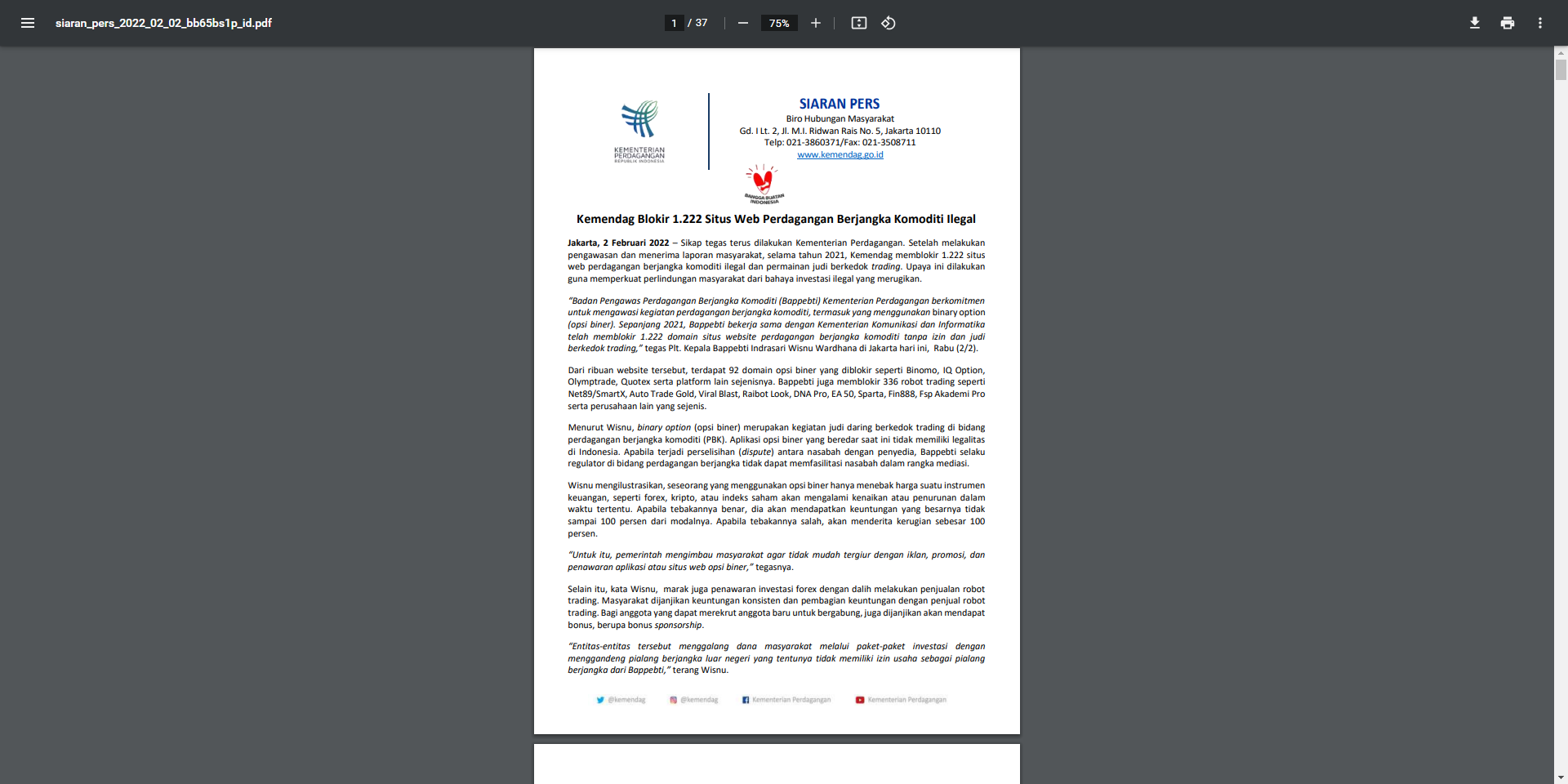 ministério do comércio bloqueia 1.222 sites ilegais de negociação de futuros de commodities Jacarta, 2 de fevereiro de 2022 - o ministério do comércio continua a assumir uma posição firme. Depois de realizar vigilância e receber relatórios públicos, durante 2021, o Ministério do Comércio bloqueou 1.222 sites para negociação ilegal de futuros de commodities e jogos de azar sob o pretexto de negociação. Este esforço é feito para fortalecer a proteção pública contra os perigos de investimentos ilegais prejudiciais. "A Agência de Supervisão de Negociação de Futuros de Commodities (Bappebti) do Ministério do Comércio está empenhada em supervisionar as atividades de negociação de futuros de commodities, incluindo aquelas que usam opções binárias (opções binárias). Ao longo de 2021, a Bappebti, em colaboração com o Ministério da Comunicação e Informática, bloqueou 1.222 domínios de sites de negociação de futuros de commodities não licenciados e jogos de azar sob o pretexto de negociação", disse Plt. Chefe do CoFTRA Indrasari Wisnu Wardhana em Jacarta hoje, quarta-feira (2/2). dos milhares de sites, existem 92 domínios de opções binárias bloqueados, como binomo, iq option, olymptrade, quotex e outras plataformas semelhantes. Bappebti também bloqueou 336 robôs de negociação, como net89/smartx, auto trade gold, viral blast, raibot look, dna pro, ea 50, sparta, fin888, fsp academy pro e outras empresas semelhantes. De acordo com Wisnu, as opções binárias são atividades de jogo online sob o disfarce de negociação no campo de negociação de futuros de commodities (pbk). Os aplicativos de opções binárias atualmente em circulação não têm legalidade na Indonésia. se houver uma disputa entre o cliente e o provedor, o CoFTRA como regulador na área de negociação de futuros não pode facilitar o cliente no contexto da mediação. Wisnu ilustra que alguém que usa opções binárias apenas adivinha o preço de um instrumento financeiro, como forex, criptomoeda ou índice de ações, experimentará um aumento ou diminuição em um determinado momento. se seu palpite estiver correto, ele obterá um lucro que não chega a 100% de seu capital. se o palpite estiver errado, você sofrerá uma perda de 100%. "Por esta razão, o governo insta o público a não ser facilmente tentado por anúncios, promoções e ofertas em aplicativos ou sites de opções binárias", disse ele. Além disso, disse Wisnu, também há ofertas frequentes de investimento forex sob o pretexto de vender robôs de negociação. a comunidade tem a promessa de lucros consistentes e participação nos lucros com vendedores de robôs comerciais. para os membros que podem recrutar novos membros para ingressar, eles também recebem um bônus, na forma de um bônus de patrocínio. "Essas entidades arrecadam fundos públicos por meio de pacotes de investimento, cooperando com corretoras estrangeiras de futuros que obviamente não possuem licenças comerciais como corretoras de futuros de Bappebti", explicou Wisnu. Nesta atividade, os criminosos supostamente violaram as disposições da lei número 10 de 2011 sobre emendas à lei número 32 de 1997 sobre negociação de futuros de commodities e eram suspeitos de abusar da legalidade das licenças comerciais de vendas diretas (SIUPL) emitidas pelo Ministério do Comércio. A SIUPL é uma licença comercial para realizar atividades comerciais de vendas diretas, ou seja, um sistema de venda de determinados produtos por meio de uma rede de marketing desenvolvida por vendedores diretos que trabalham com base em comissões e/ou bônus com base nas receitas de vendas a consumidores fora dos locais de varejo. bens que incluam produtos futuros de commodities de acordo com as disposições de leis e regulamentos e/ou serviços são proibidos de serem comercializados por meio de um sistema de venda direta. Em geral, durante 2021, além das opções binárias e da oferta de pacotes de investimento forex sob o pretexto de vender robôs de negociação, os sites bloqueados são duplicatas de sites de corretores de futuros que possuem licenças da Bappebti e introduzem sites de corretores (intermediários) de corretores de futuros estrangeiros, como OctaFX , fbs e similares. Wisnu afirmou que o CoFTRA continua tentando informar e lembrar o público sobre investimentos. “Espera-se que o público sempre verifique a legalidade das empresas que oferecem investimentos, conheça os prós e contras, não acredite facilmente na sedução da renda fixa, renda passiva e lucros altos. Lembre-se também de que o PB é um investimento de alto risco e alto retorno. não deixe os investidores quererem lucrar, em vez disso, eles ficam perplexos ", disse wisnu. Na mesma ocasião, o chefe do Bureau of Laws and Enforcement, Bappebti Aldison, disse que o CoFTRA realiza rotineiramente supervisão e observação de sites no setor Pbk que não possuem licença da Bappebti. “A fiscalização é feita para evitar prejuízos à comunidade. tendo em vista que atualmente surgiram novas modalidades para atrair o público tentado a se tornar investidor no setor de pbk sem atentar para o conhecimento dos mecanismos de negociação nesse campo", disse Aldison. Bappebti também apelou ao público para ser mais atento na escolha de investimentos no setor Pbk para sempre garantir a legalidade dos corretores de futuros que oferecem investimentos e não ser facilmente tentados pela atração de lucros definidos além dos limites razoáveis em um curto espaço de tempo. “Também se espera que a comunidade esteja sempre ciente das ofertas com o objetivo de obter bônus ou comissões se conseguirem recrutar novos membros como downlines. o conceito da rede inferior não é bem conhecido nas negociações de futuros", disse Aldison. Informações completas sobre a legalidade dos atores comerciais no setor de Pbk podem ser consultadas no site oficial da Bappebti https://www.bap