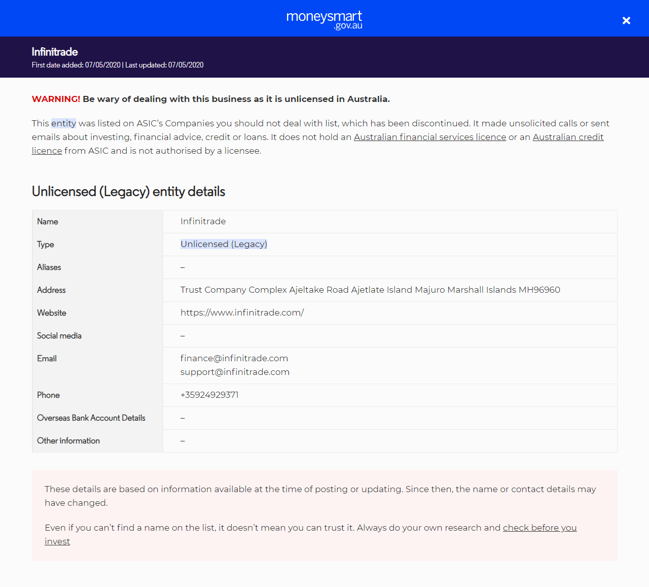 TipoNão licenciado (Legado) Uma entidade não licenciada. Esta entrada é proveniente da 'lista de empresas com as quais você não deve lidar', que foi descontinuada em 2023.