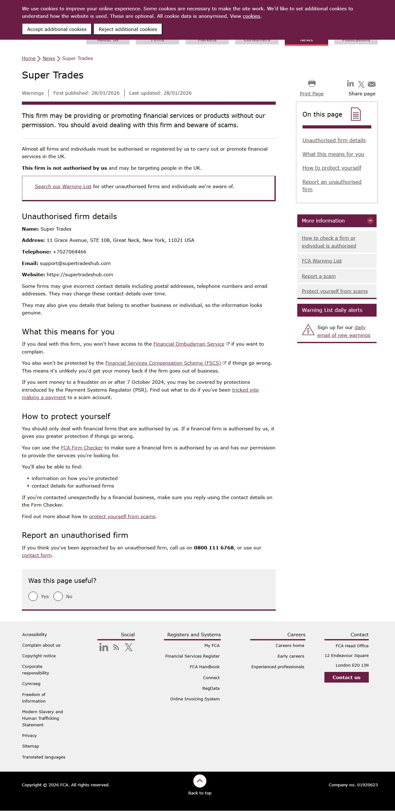 ['Esta empresa pode estar a fornecer ou a promover serviços ou produtos financeiros sem a nossa autorização. Deve evitar lidar com esta empresa e ter cuidado com fraudes. Quase todas as empresas e indivíduos devem estar autorizados ou registados por nós para realizar ou promover serviços financeiros no Reino Unido. Esta empresa não está autorizada por nós e pode estar a direcionar-se a pessoas no Reino Unido. Consulte a nossa Lista de Avisos para outras empresas e indivíduos não autorizados de que temos conhecimento. Detalhes da empresa não autorizada Nome: Super Trades Endereço: 11 Grace Avenue, STE 108, Great Neck, Nova Iorque, 11021 EUA Telefone: +7027064466 E-mail: support@supertradeshub.com Website: https://supertradeshub.com Algumas empresas podem fornecer detalhes de contacto incorretos, incluindo endereços postais, números de telefone e endereços de e-mail. Podem alterar estes detalhes de contacto ao longo do tempo. Também podem fornecer-lhe detalhes que pertencem a outro negócio ou indivíduo, para que a informação pareça genuína. '].