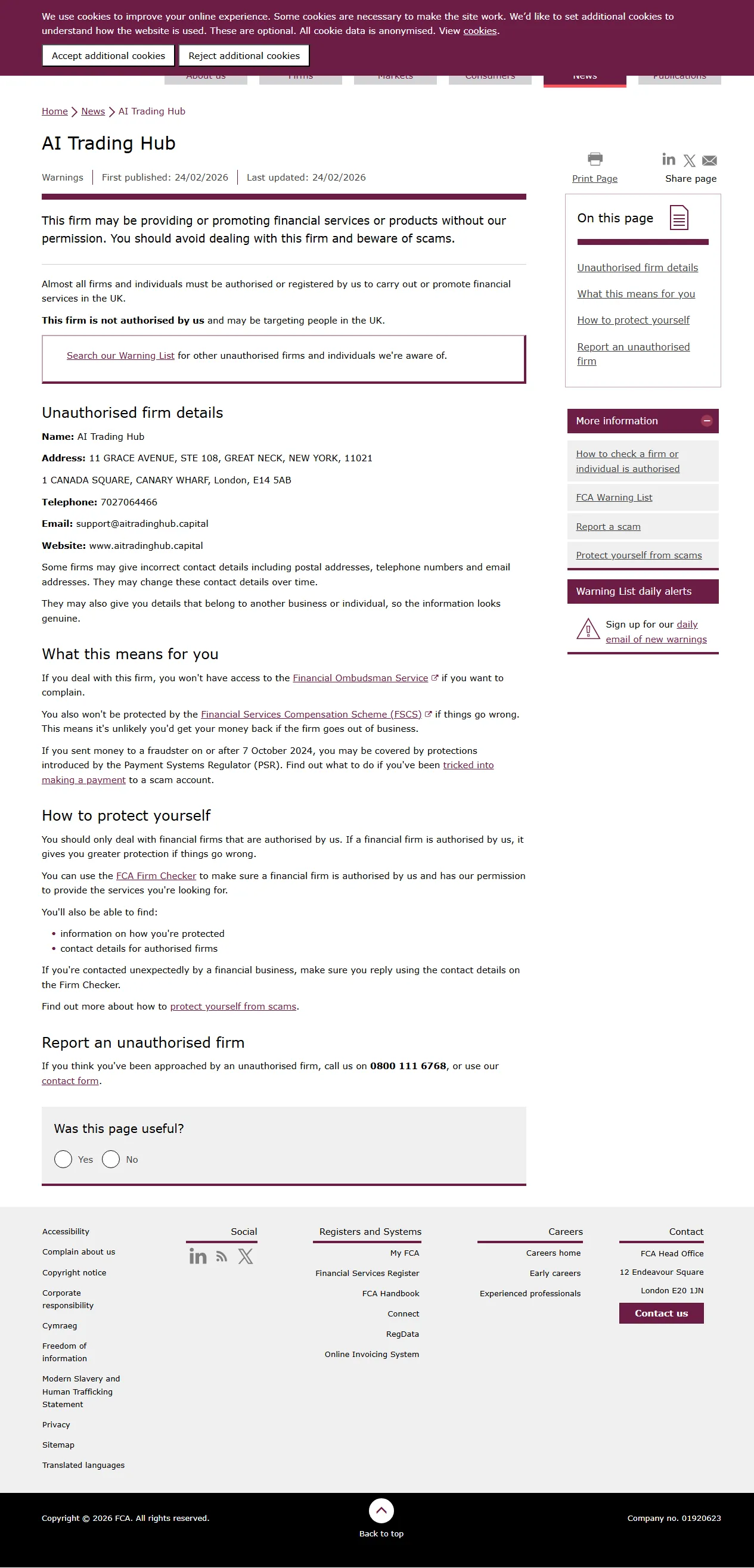 ['Esta empresa pode estar fornecendo ou promovendo serviços ou produtos financeiros sem a nossa autorização. Você deve evitar lidar com esta empresa e estar atento a golpes. Quase todas as empresas e indivíduos devem ser autorizados ou registrados por nós para realizar ou promover serviços financeiros no Reino Unido. Esta empresa não está autorizada por nós e pode estar direcionando-se a pessoas no Reino Unido. Consulte nossa Lista de Avisos para outras empresas e indivíduos não autorizados que conhecemos. Detalhes da empresa não autorizada Nome: AI Trading Hub Endereço: 11 GRACE AVENUE, STE 108, GREAT NECK, NOVA YORK, 11021 1 CANADA SQUARE, CANARY WHARF, Londres, E14 5AB Telefone: 7027064466 E-mail: support@aitradinghub.capital Site: www.aitradinghub.capital Algumas empresas podem fornecer detalhes de contato incorretos, incluindo endereços postais, números de telefone e endereços de e-mail. Eles podem alterar esses dados de contato ao longo do tempo. Eles também podem fornecer detalhes que pertencem a outro negócio ou indivíduo, para que a informação pareça genuína.'].