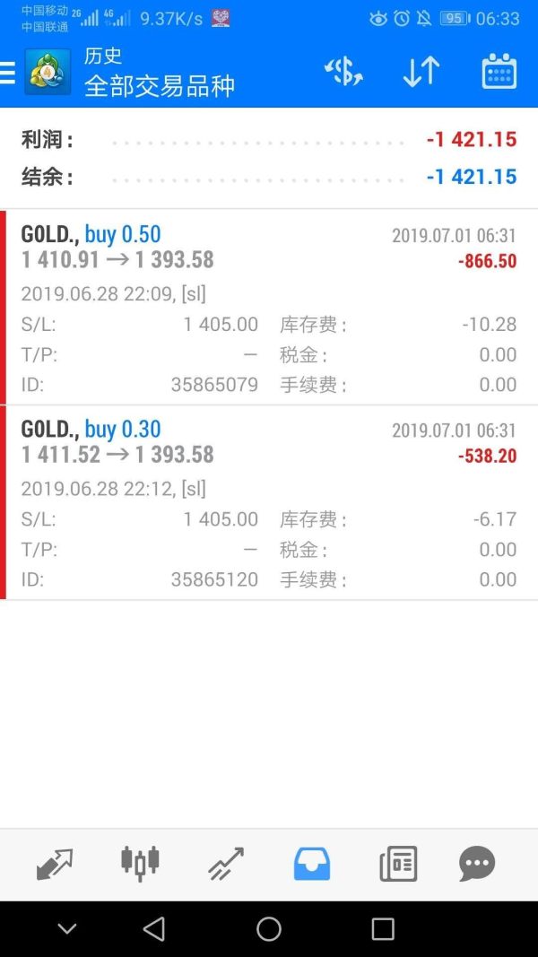 在此平台交易,6月28日下单黄金两单多单。开仓位1410附近,止损设置1405,共计0.8手,7月1日开盘跳空,账户甚至还有负值,最后1393止损,跳了20多个点,最终结果爆仓,并且连预付款都爆了,平台规定开盘半小时内100%强制平仓,我的却剩下30%才平仓。最后账户剩下300多美刀。平台客服只会复制粘贴回复,什么作用都没有。我的另一个朋友也在这个平台,1410做的空单,止盈设1407,结果却是1398止盈。而我止损却是1393,公司客服还企图欺骗我,说什么按照最新价格成交,相差5个点也叫最新价格??