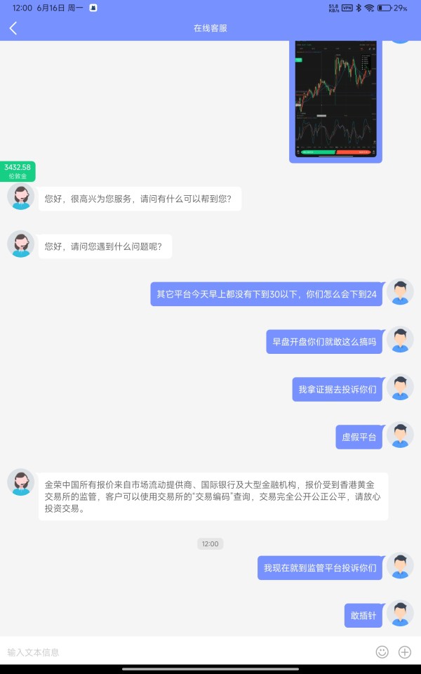 我3429的本,今天早盘高开其它平台都没下到3432的位置,就金融中国直接下到3424,整整滑了8个点,我止损位也是3429,简直是气死人,都别玩这个平台,流动性不行,真的是气死了。