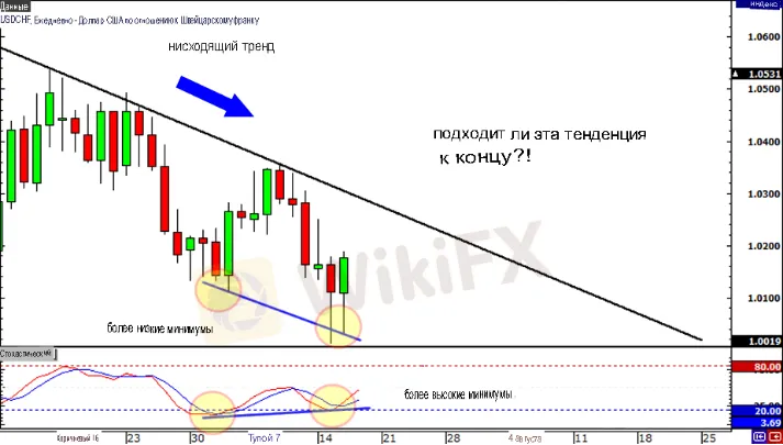 Обратите внимание, как цена сформировала более низкий максимум, но стохастик (Stochastic-индикатор) печатает более высокие максимумы.