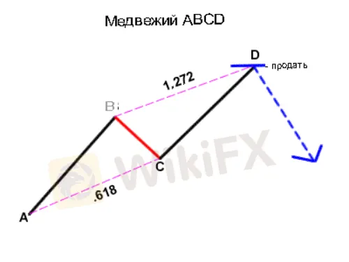 Если вы используете инструмент коррекции Фибоначчи на отрезке AB, коррекция BC должна достичь уровня 0,618. Далее, линия CD должна быть расширением Фибоначчи 1.272 от BC.