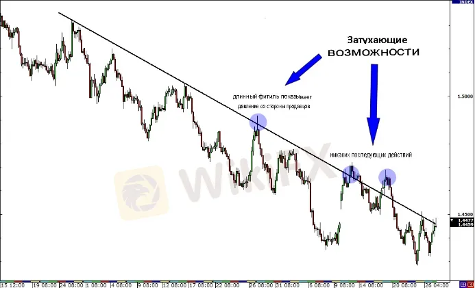 При затухающих прорывах всегда помните, что между линией тренда и ценой должно быть ПРОСТРАНСТВО.