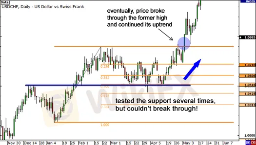 Давайте вернемся к тому примеру с графиком USD/CHF, который мы показывали вам в предыдущем уроке.