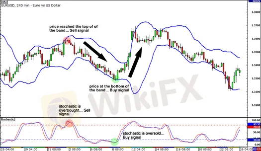 В этом первом примере у нас есть полосы Боллинджера и Стохастик на 4-часовом графике EUR/USD.