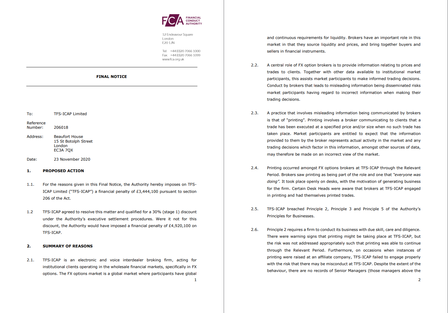 Управление финансового надзора (FCA) оштрафовало TFS-ICAP Ltd, брокера форекс-опционов, на 3,44 млн фунтов стерлингов за предоставление клиентам вводящей в заблуждение информации. В период с 2008 по 2015 год брокеры TFS-ICAP проводили практику «печати» сделок. При этом брокеры сообщали своим клиентам, что сделка состоялась по определенной цене и/или количеству, хотя на самом деле такой сделки не было. Брокеры TFS-ICAP в нескольких брокерских центрах делали это открыто и в течение длительного периода времени. Торговля полиграфией была направлена на то, чтобы побудить клиентов торговать, когда они могли этого не делать, чтобы создать бизнес для TFS-ICAP. Таким образом, TFS-ICAP не соблюдал надлежащие стандарты поведения на рынке. Кроме того, TFS-ICAP не реагировала на предупреждающие признаки того, что печать может иметь место, и не предпринимала действий для устранения риска, связанного с этим, и поэтому не действовала с должным умением, осторожностью и усердием. Также не было никаких записей, подтверждающих практику, что, в свою очередь, означало, что расследование должно было установить существование практики, которая была непрозрачной и не зарегистрирована ни в одной из записей TFS-ICAP. У TFS-ICAP также были недостатки в механизмах надзора и соблюдения требований для выявления и противодействия риску предоставления брокерами информации о цене или количестве на том основании, что она была основана на фактических сделках, когда они не проводились. Марк Стюард, исполнительный директор по правоприменению и надзору за рынком, сказал: «Этому рынку следует обратить внимание на то, что печать или предоставление информации клиентам, на основании которой информация не соответствует действительности, не соответствует надлежащим стандартам поведения на рынке. Рынок также должен принять к сведению, что непрозрачность таких практик, хотя и сложная с судебной точки зрения, также не является препятствием для действий». FCA благодарит Комиссию по торговле товарными фьючерсами США за помощь в этом расследовании. TFS-ICAP согласилась урегулировать это дело с FCA, тем самым получив право на 30% скидку к общему наложенному финансовому штрафу. Без этой скидки FCA наложило бы финансовый штраф в размере 4,92 миллиона фунтов стерлингов.