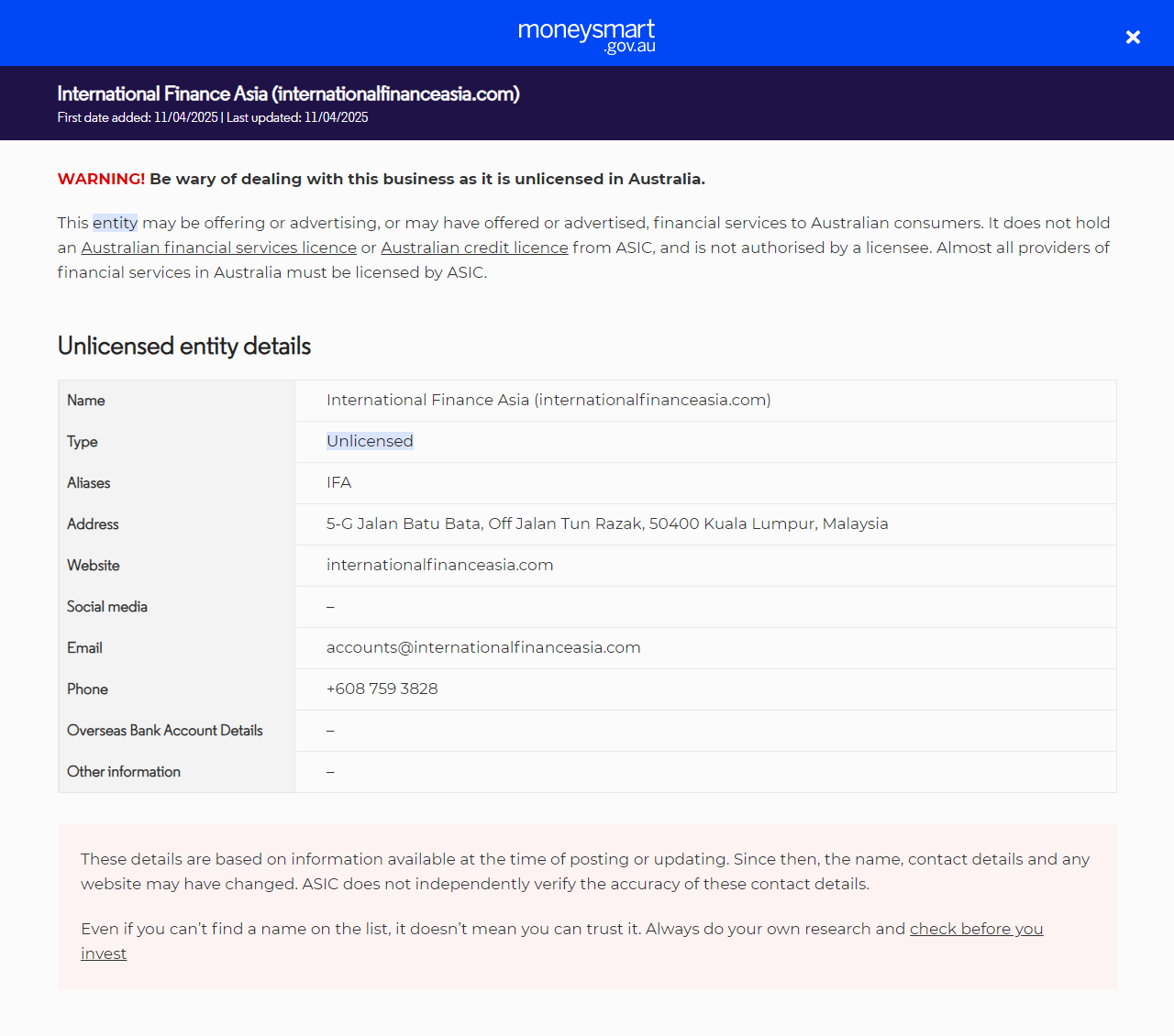 ТипНезаконное предложение финансовых услуг (включая финансовые продукты) людям в Австралии без лицензии. Они не имеют лицензии на предоставление финансовых услуг (AFS) или австралийской кредитной лицензии от ASIC.