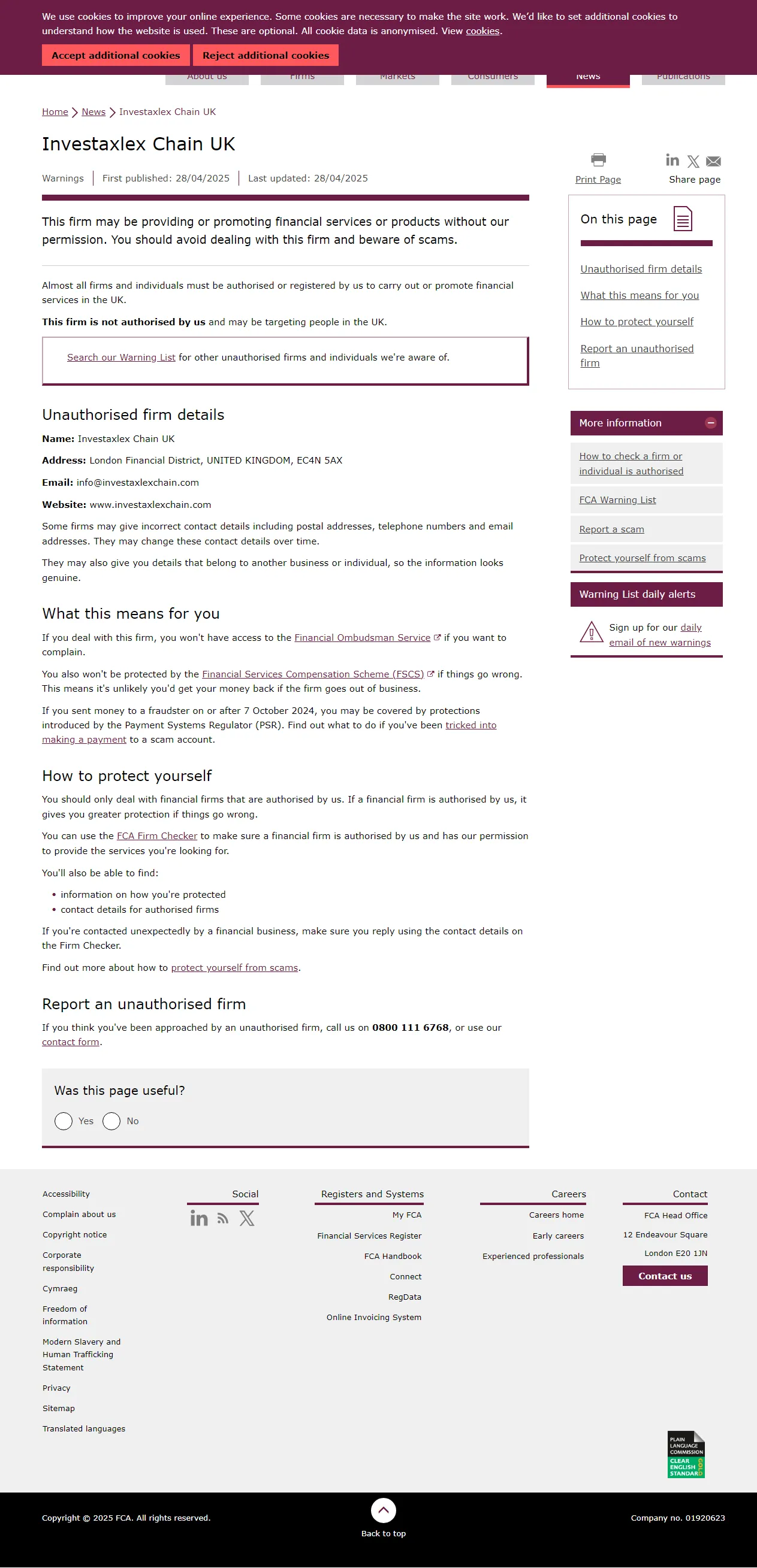 ['Эта компания может предоставлять или продвигать финансовые услуги или продукты без нашего разрешения. Вам следует избегать сделок с этой компанией и остерегаться мошенничества. Почти все компании и частные лица должны быть авторизованы или зарегистрированы у нас для осуществления или продвижения финансовых услуг в Великобритании. Эта компания не авторизована нами и может нацеливаться на людей в Великобритании. Найдите в нашем Предупредительном списке другие неавторизованные компании и частных лиц, о которых нам известно. Данные неавторизованной компании Название: Investaxlex Chain UK Адрес: Лондонский финансовый район, СОЕДИНЕННОЕ КОРОЛЕВСТВО, EC4N 5AX Электронная почта: info@investaxlexchain.com Веб-сайт: www.investaxlexchain.com Некоторые компании могут предоставлять неверные контактные данные, включая почтовые адреса, телефонные номера и адреса электронной почты. Они могут со временем менять эти контактные данные. Они также могут предоставлять вам данные, принадлежащие другому бизнесу или частному лицу, чтобы информация выглядела подлинной. '].
