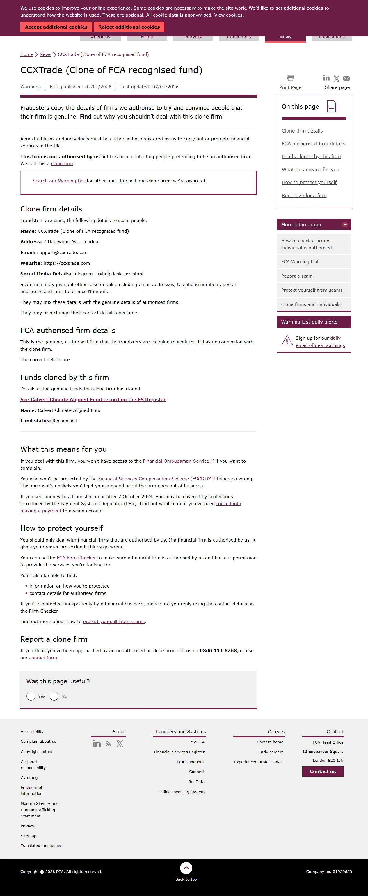 Мошенники копируют данные фирм, которые мы уполномочиваем, чтобы попытаться убедить людей в том, что их фирма является подлинной. Узнайте, почему вам не следует иметь дело с этой фирмой-клоном. Почти все фирмы и частные лица должны быть уполномочены или зарегистрированы нами для осуществления или продвижения финансовых услуг в Великобритании. Эта фирма не уполномочена нами, но связывалась с людьми, выдавая себя за уполномоченную фирму. Мы Вызов это фирмой-клоном. Найдите в нашем Предупредительном списке другие неуполномоченные фирмы и фирмы-клоны, о которых нам известно. Данные фирмы-клона Мошенники используют следующие данные, чтобы Мошенничество людей: Название: CCXTrade (Клон признанного фонда FCA) Адрес: 7 Harewood Ave, London Электронная почта: support@ccxtrade.com Веб-сайт: https://ccxtrade.com Данные в социальных сетях: Telegram - @helpdesk_assistant Мошенники могут предоставлять другие ложные данные, включая адреса электронной почты, номера телефонов, почтовые адреса и номера регистрации фирм. Они могут смешивать эти данные с подлинными данными уполномоченных фирм. Они также могут со временем менять свои контактные данные. Данные фирмы, уполномоченной FCA Это подлинная, уполномоченная фирма, за которую, как утверждают мошенники, они работают. Она не имеет никакой связи с фирмой-клоном. Правильные данные: Фонды, клонированные этой фирмой Данные подлинных фондов, которые клонировала эта фирма-клон. См. запись Calvert Climate Aligned Fund в Регистре FS Название: Calvert Climate Aligned Fund Статус фонда: Признанный.