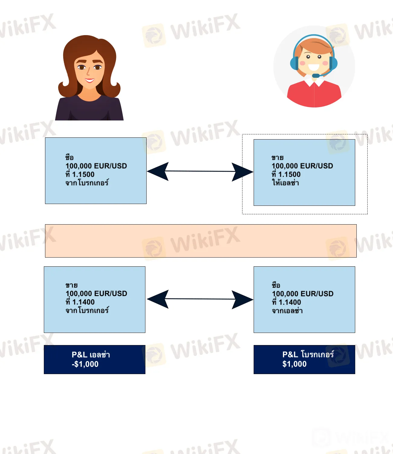 ในตัวอย่างข้างต้น Elsa ทำการ long 100,000 EUR/USD ที่ 1.1500 โบรกเกอร์ของเธอ “B-Booked” (ทำตรงกันข้าม) การเทรดและสั้น 100,000 EUR/USD