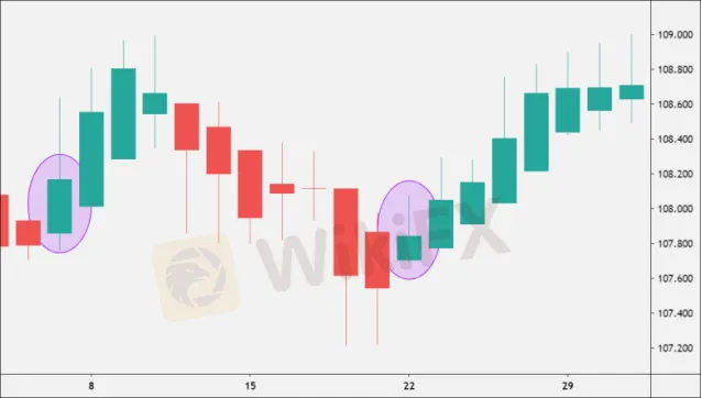 3. แท่งเทียนที่มีตัวแท่งเล็กแสดงเงาบนและล่างบ่งชี้แนวโน้มการกลับตัวของเทรนด์ (หรือเทรนด์หยุดชั่วคราว)
