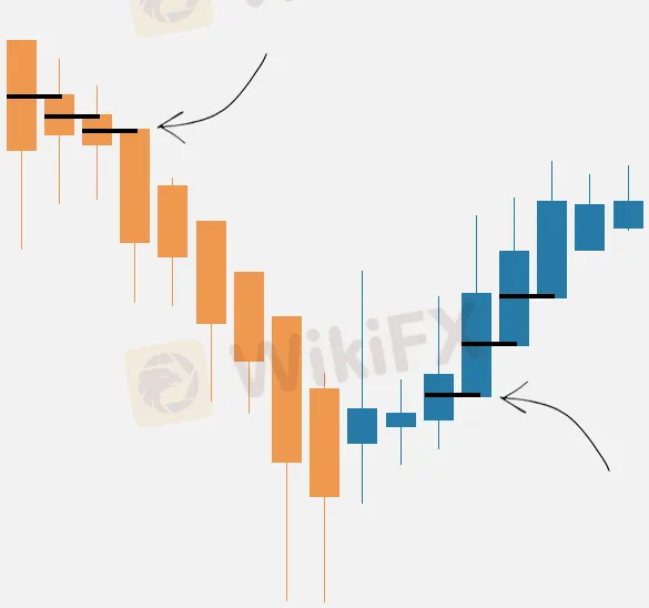 หากคุณดูกราฟ Heikin Ashi อย่างใกล้ชิด คุณจะสังเกตเห็นว่าแท่งเทียน Heikin Ashi แต่ละแท่งเริ่มต้นจาก ตรงกลาง ของแท่งเทียนก่อนหน้านั้น และไม่ได้เริ่มจากระดับที่แท่งเทียนก่อนหน้าปิด