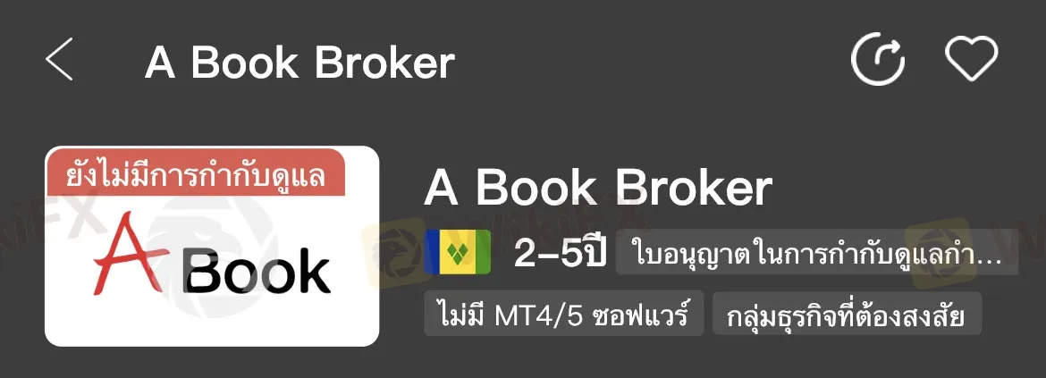 ส่วนโบรกเกอร์ Abook นี่ต่างกันโดยสิ้นเชิงเลย เพราะมันคือชื่อของโบรกเกอร์เจ้าหนึ่งที่ไม่มีใบอนุญาตจากหน่วยงานกำกับดูแล โดยโบรกเกอร์นี้ใช้ชื่อเต็ม ๆ ว่า ‘A Book Broker’ ใครเห็นก็ต้องสับสนแน่ ๆ ขอเตือนว่าให้ระวังไว้ให้ดีนะ ห้ามสับสน เพราะโบรกเกอร์เจ้านี้ไม่มีการควบคุมดูแลอย่างมีประสิทธิภาพ แถมยังเคยโดนร้องเรียนเกี่ยวกับความผิดปกติของกราฟ และมีคะแนนจาก WikiFX เพียง 1.39/10 เท่านั้น โปรดใช้วิจารณญาณในการตัดสินใจ และระวังความเสี่ยงที่อาจจะเกิดขึ้น เตือนแล้วนะ!