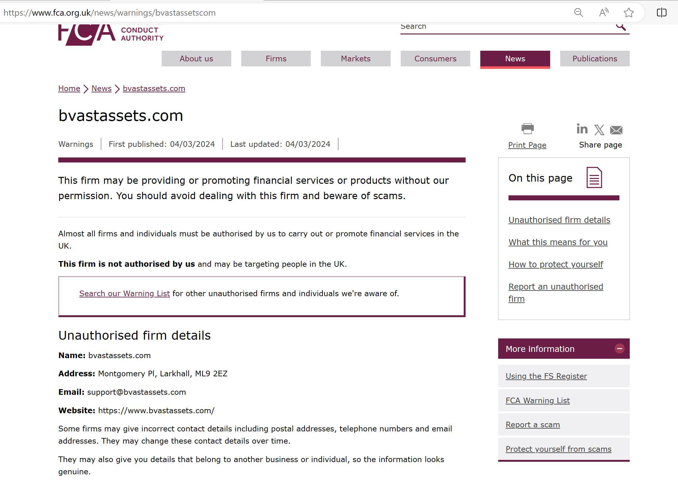 รายการเตือนของ FCA เกี่ยวกับบริษัทที่ไม่มีอนุญาต bvastassets.com.