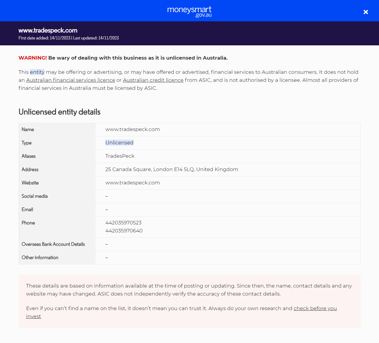 ประเภทไม่มีใบอนุญาตให้บริการทางการเงิน (รวมถึงผลิตภัณฑ์ทางการเงิน) แก่บุคคลในออสเตรเลียโดยไม่มีใบอนุญาต พวกเขาไม่มีใบอนุญาตให้บริการทางการเงินของออสเตรเลีย (AFS) หรือใบอนุญาตสินเชื่อของออสเตรเลียจาก ASIC