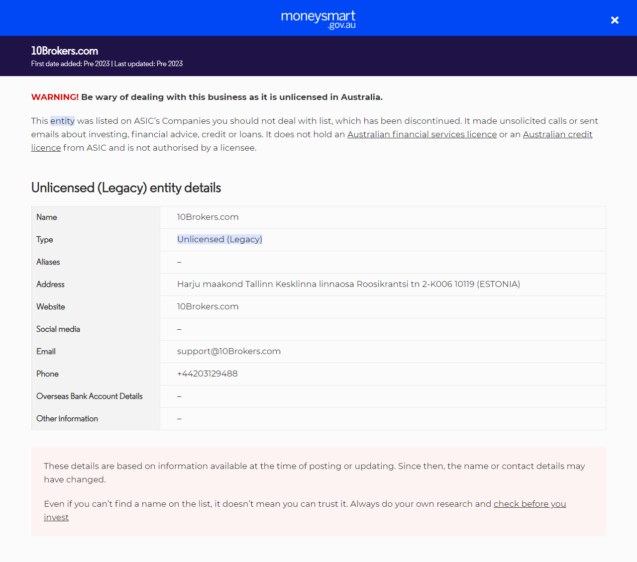 รายการแจ้งเตือนนักลงทุน10Brokers.com.