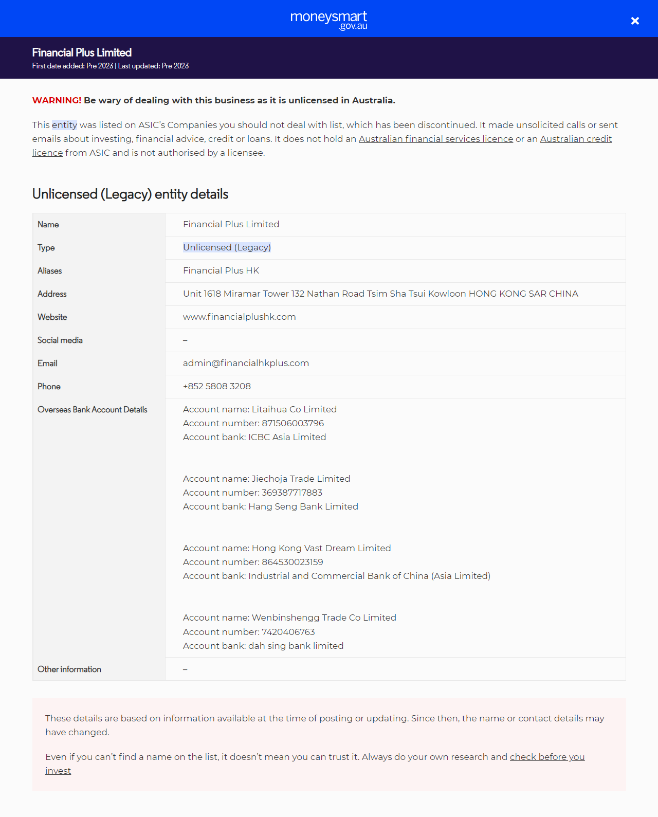 รายการแจ้งเตือนนักลงทุนFinancial Plus จำกัด.