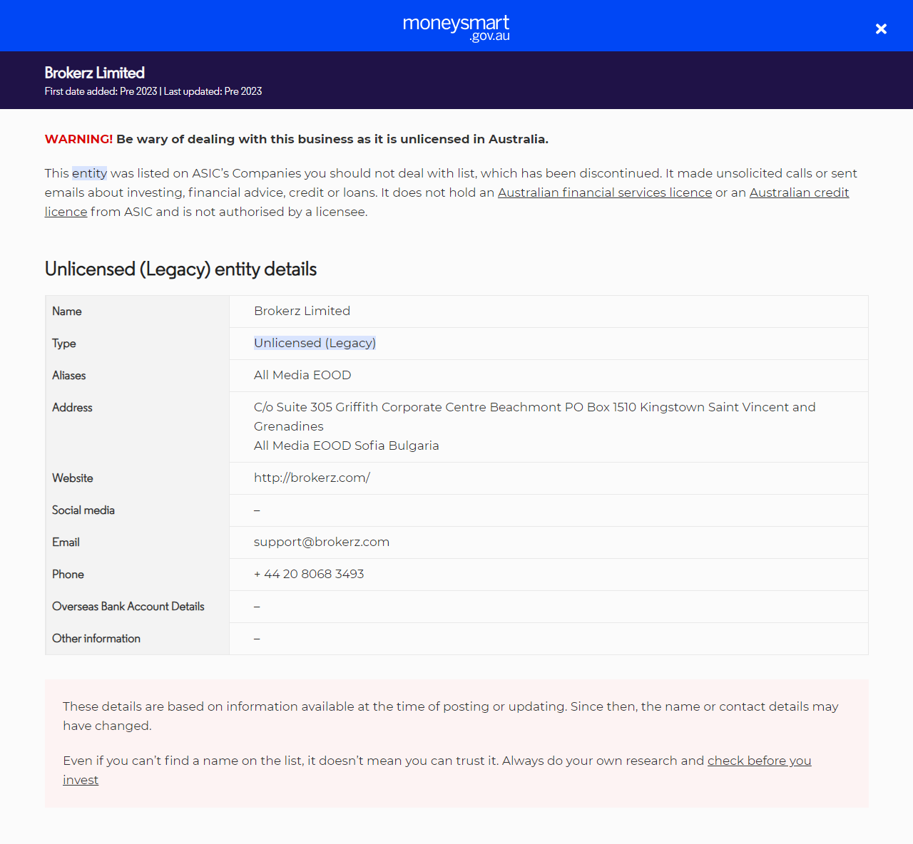 รายการแจ้งเตือนนักลงทุนBrokerz Limited.