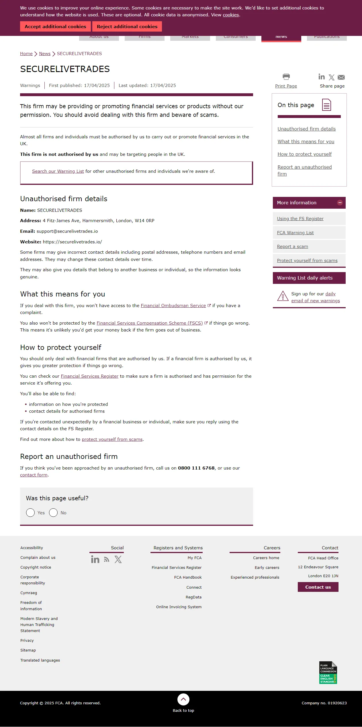 ['บริษัทนี้อาจให้บริการหรือส่งเสริมบริการทางการเงินหรือผลิตภัณฑ์โดยไม่ได้รับอนุญาตจากเรา คุณควรหลีกเลี่ยงการติดต่อกับบริษัทนี้และระวังการหลอกลวง เกือบทุกบริษัทและบุคคลต้องได้รับอนุญาตจากเราเพื่อดำเนินการหรือส่งเสริมบริการทางการเงินในสหราชอาณาจักร บริษัทนี้ไม่ได้รับอนุญาตจากเราและอาจกำลังกำหนดเป้าหมายไปยังผู้คนในสหราชอาณาจักร ค้นหารายชื่อเตือนของเราเพื่อดูบริษัทและบุคคลอื่นๆ ที่ไม่ได้รับอนุญาตซึ่งเราทราบ รายละเอียดบริษัทที่ไม่ได้รับอนุญาต ชื่อ: SECURELIVETRADES ที่อยู่: 4 Fitz-James Ave, Hammersmith, London, W14 0RP อีเมล: support@securelivetrades.io เว็บไซต์: https://securelivetrades.io/ บางบริษัทอาจให้รายละเอียดการติดต่อที่ไม่ถูกต้องรวมถึงที่อยู่ไปรษณีย์ หมายเลขโทรศัพท์ และที่อยู่อีเมล พวกเขาอาจเปลี่ยนรายละเอียดการติดต่อเหล่านี้เมื่อเวลาผ่านไป พวกเขาอาจให้รายละเอียดที่เกี่ยวข้องกับธุรกิจหรือบุคคลอื่นแก่คุณด้วย ดังนั้นข้อมูลจึงดูเหมือนเป็นของจริง '].