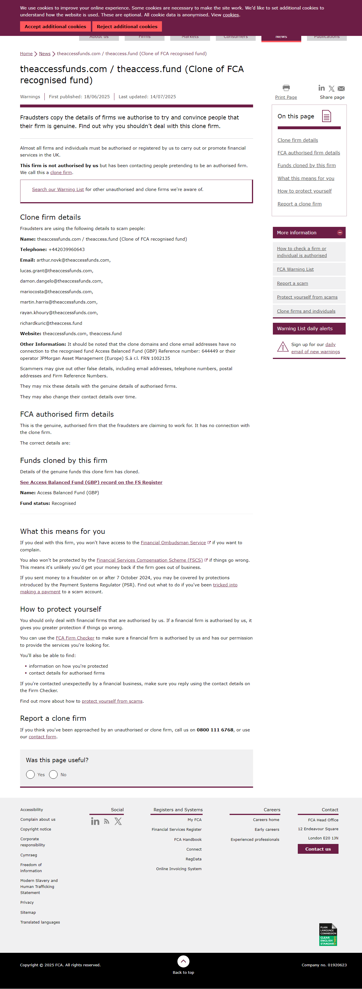 FCA รายชื่อเตือนบริษัทที่ไม่มีอนุญาต theaccessfunds.com / theaccess.fund (โคลนของกองทุนที่ FCA รับรอง).