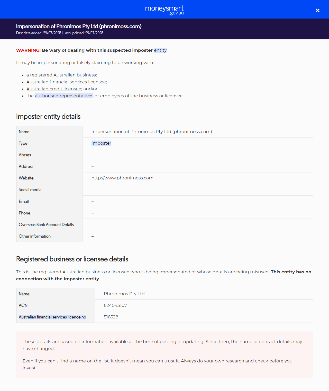 รายการแจ้งเตือนนักลงทุนการแอบอ้างเป็น Phronimos Pty Ltd (phronimoss.com).