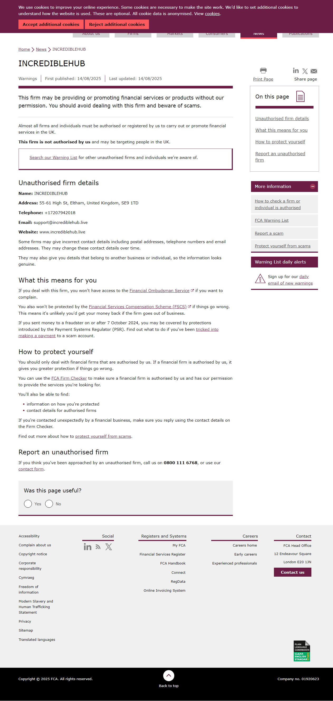 บริษัทนี้อาจให้บริการหรือส่งเสริมบริการทางการเงินหรือผลิตภัณฑ์โดยไม่ได้รับอนุญาตจากเรา คุณควรหลีกเลี่ยงการติดต่อกับบริษัทนี้และระวังการหลอกลวง บริษัทและบุคคลเกือบทั้งหมดต้องได้รับอนุญาตหรือจดทะเบียนกับเราเพื่อดำเนินการหรือส่งเสริมบริการทางการเงินในสหราชอาณาจักร บริษัทนี้ไม่ได้รับอนุญาตจากเราและอาจกำหนดเป้าหมายไปที่ผู้คนในสหราชอาณาจักร ค้นหารายชื่อเตือนของเราเพื่อดูข้อมูลอื่นๆ บริษัทและบุคคลที่ไม่มีอำนาจที่เราทราบ รายละเอียดบริษัทที่ไม่มีอำนาจ ชื่อ: INCREDIBLEHUB ที่อยู่: 55-61 High St, Eltham, United Kingdom, SE9 1TD โทรศัพท์: +17207942018 อีเมล: support@incrediblehub.live เว็บไซต์: www.incrediblehub.live บางบริษัทอาจให้รายละเอียดการติดต่อที่ไม่ถูกต้อง รวมถึงที่อยู่ไปรษณีย์ หมายเลขโทรศัพท์ และที่อยู่อีเมล พวกเขาอาจเปลี่ยนรายละเอียดการติดต่อเหล่านี้เมื่อเวลาผ่านไป พวกเขาอาจให้คุณ รายละเอียดที่ เป็นของธุรกิจหรือบุคคลอื่น ดังนั้นข้อมูลจึงดูเหมือนจริง.