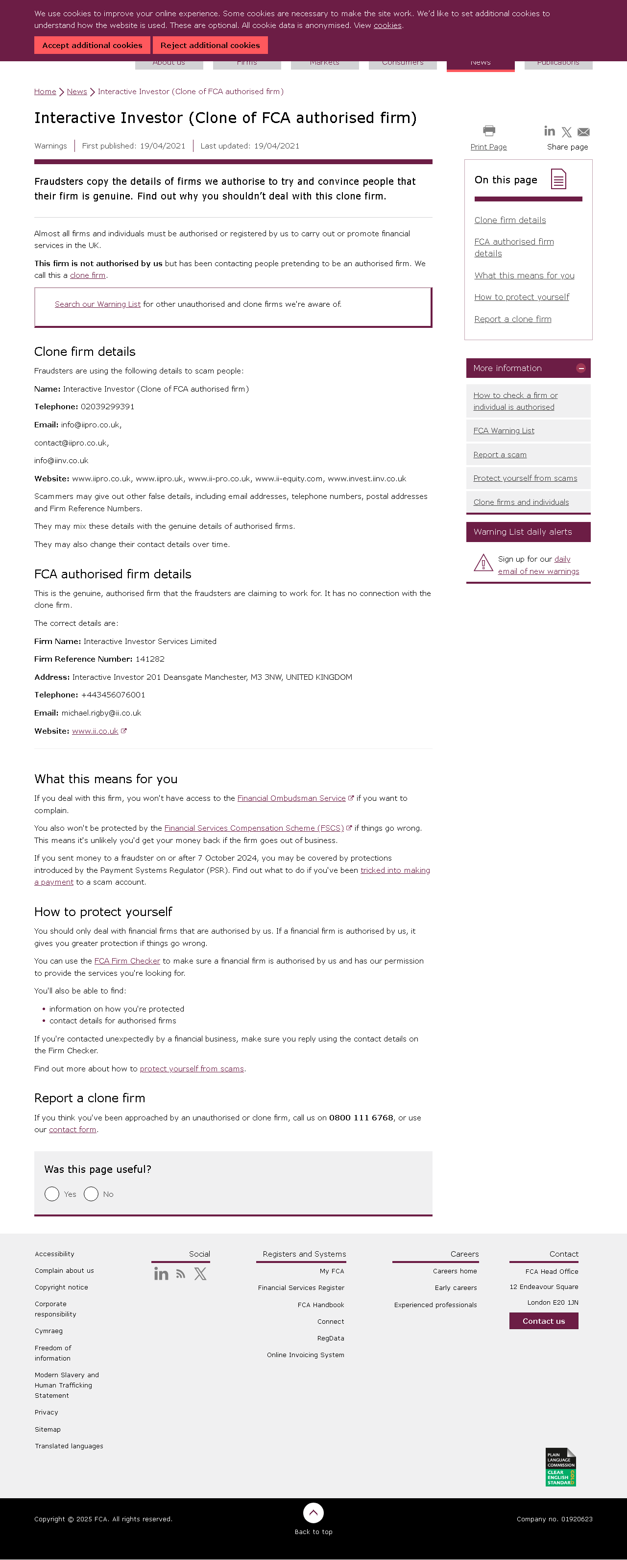 เว็บไซต์: www.iipro.co.uk www.iipro.uk, www.ii-pro.co.uk, www.ii-equity.com, www.invest.iinv.co.uk ผู้หลอกลวงอาจให้รายละเอียดปลอมอื่นๆ รวมถึงที่อยู่อีเมล หมายเลขโทรศัพท์ ที่อยู่ไปรษณีย์ และหมายเลขอ้างอิงบริษัท พวกเขาอาจผสมรายละเอียดเหล่านี้กับรายละเอียดจริงของบริษัทที่ได้รับอนุญาต และอาจเปลี่ยนข้อมูลติดต่อเมื่อเวลาผ่านไป รายละเอียดบริษัทที่ได้รับอนุญาตจาก FCA นี่คือบริษัทที่ได้รับอนุญาตจริงที่ผู้หลอกลวงอ้างว่าทำงานให้ ซึ่งไม่มีส่วนเกี่ยวข้องกับบริษัทปลอม รายละเอียดที่ถูกต้องคือ: ชื่อบริษัท: Interactive Investor Services Limited หมายเลขอ้างอิงบริษัท: 141282 ที่อยู่: Interactive Investor 201 Deansgate แมนเชสเตอร์, M3 3NW, สหราชอาณาจักร โทรศัพท์: +443456076001 อีเมล: michael.rigby@ii.co.uk เว็บไซต์: www.ii.co.uk.