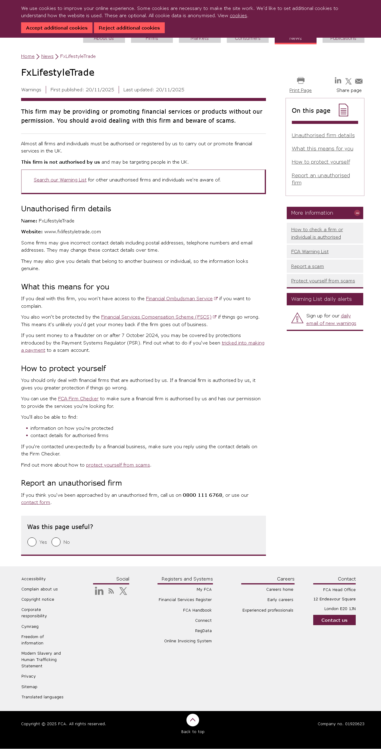 บริษัทนี้อาจให้บริการหรือส่งเสริมบริการทางการเงินหรือผลิตภัณฑ์โดยไม่ได้รับอนุญาตจากเรา คุณควรหลีกเลี่ยงการติดต่อกับบริษัทนี้และระวังการหลอกลวง บริษัทและบุคคลเกือบทั้งหมดต้องได้รับอนุญาตหรือจดทะเบียนกับเราก่อนจึงจะสามารถดำเนินการหรือส่งเสริมบริการทางการเงินในสหราชอาณาจักรได้ บริษัทนี้ไม่ได้รับอนุญาตจากเราและอาจกำลังกำหนดเป้าหมายไปที่ผู้คนในสหราชอาณาจักร ค้นหารายชื่อเตือนของเราสำหรับบริษัทและบุคคลอื่นๆ ที่ไม่ได้รับอนุญาตที่เราทราบ รายละเอียดบริษัทที่ไม่มีสิทธิ์ ชื่อ: FxLifestyleTrade เว็บไซต์: www.fxlifestyletrade.com บางบริษัทอาจให้รายละเอียดการติดต่อที่ไม่ถูกต้อง รวมถึงที่อยู่ไปรษณีย์ หมายเลขโทรศัพท์ และที่อยู่อีเมล พวกเขาอาจเปลี่ยนรายละเอียดการติดต่อเหล่านี้เมื่อเวลาผ่านไป พวกเขาอาจให้รายละเอียดที่เกี่ยวข้องกับธุรกิจหรือบุคคลอื่น เพื่อให้ข้อมูลดูเหมือนจริง.