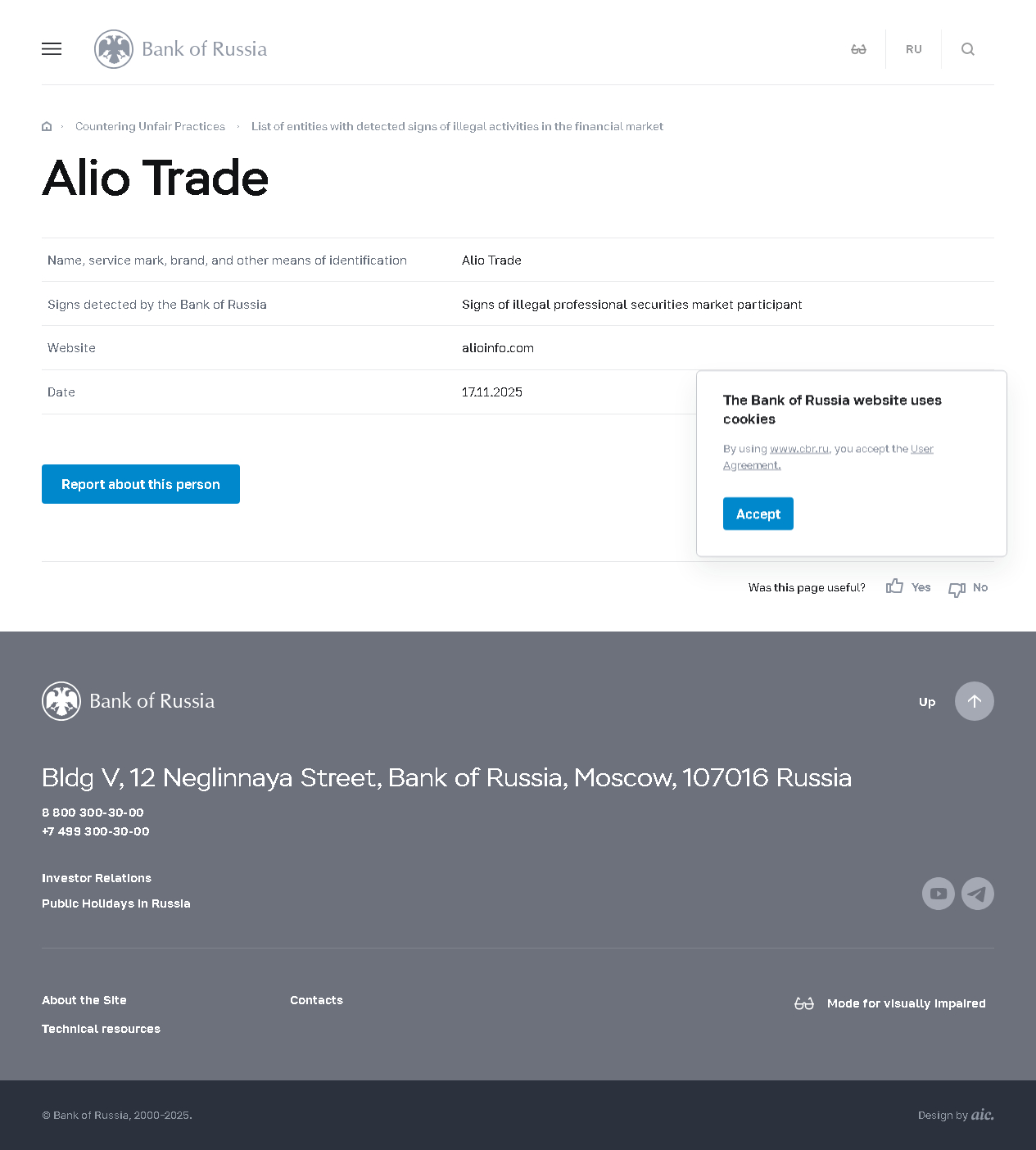 ชื่อ, เครื่องหมายบริการ, แบรนด์ และวิธีการระบุตัวตนอื่น ๆ Alio Trade สัญญาณที่ตรวจพบโดยธนาคารรัสเซีย สัญญาณของผู้เข้าร่วมตลาดหลักทรัพย์ที่ผิดกฎหมาย เว็บไซต์ alioinfo.com วันที่ 17.11.2025.