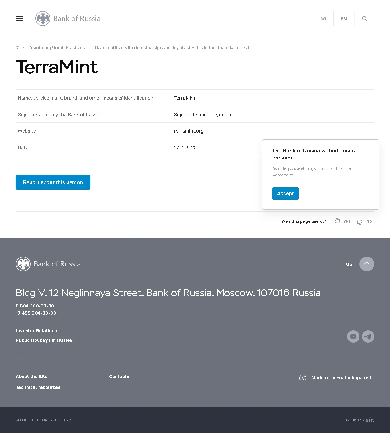 รายชื่อหน่วยงานที่ตรวจพบสัญญาณของกิจกรรมที่ผิดกฎหมายในตลาดการเงิน TerraMint.