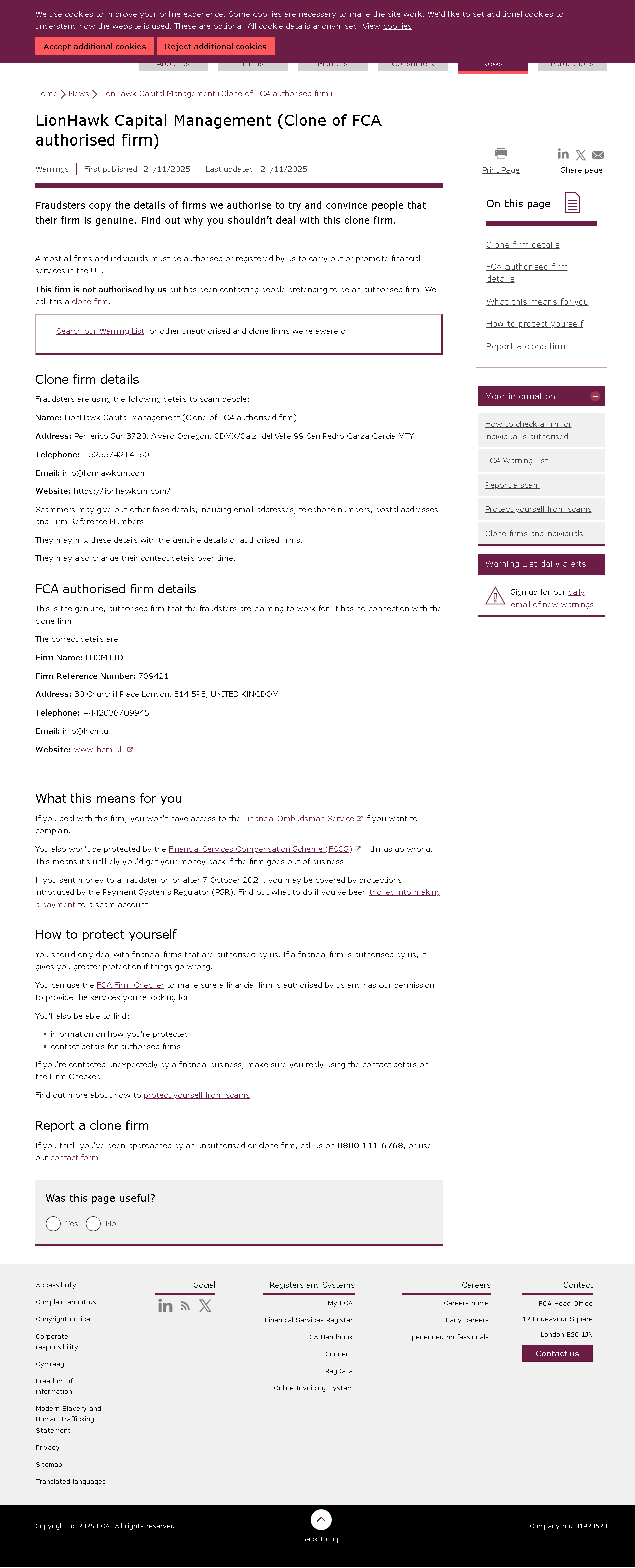 นักต้มตุ๋นคัดลอกรายละเอียดของบริษัทที่เราให้อนุญาตเพื่อพยายามโน้มน้าวให้ผู้คนเชื่อว่าบริษัทของพวกเขาเป็นของแท้ ค้นหาว่าทำไมคุณไม่ควรติดต่อกับบริษัทโคลนนิงนี้ บริษัทและบุคคลเกือบทั้งหมดต้องได้รับอนุญาตหรือจดทะเบียนจากเราเพื่อดำเนินการหรือส่งเสริมบริการทางการเงินในสหราชอาณาจักร บริษัทนี้ไม่ได้รับอนุญาตจากเรา แต่ได้ติดต่อผู้คนโดยแสร้งทำเป็นบริษัทที่ได้รับอนุญาต เราเรียกสิ่งนี้ว่าบริษัทโคลนนิง ค้นหารายชื่อบริษัทโคลนนิงและบริษัทที่ไม่ได้อนุญาตอื่นๆ ที่เราทราบในรายการเตือนของเรา รายละเอียดบริษัทโคลนนิง นักต้มตุ๋นกำลังใช้รายละเอียดต่อไปนี้เพื่อหลอกลวงผู้คน: ชื่อ: LionHawk Capital Management (โคลนนิงของบริษัทที่ได้รับอนุญาตจาก FCA) ที่อยู่: Periferico Sur 3720, Álvaro Obregón, CDMX/Calz. del Valle 99 San Pedro Garza García MTY โทรศัพท์: +525574214160 อีเมล: info@lionhawkcm.com เว็บไซต์: https://lionhawkcm.com/ นักต้มตุ๋นอาจให้รายละเอียดปลอมอื่น ๆ รวมถึงที่อยู่อีเมล หมายเลขโทรศัพท์ ที่อยู่ไปรษณีย์ และหมายเลขอ้างอิงของบริษัท พวกเขาอาจผสมรายละเอียดเหล่านี้กับรายละเอียดจริงของบริษัทที่ได้รับอนุญาต นอกจากนี้พวกเขาอาจเปลี่ยนข้อมูลติดต่อเมื่อเวลาผ่านไป รายละเอียดบริษัทที่ได้รับอนุญาตจาก FCA นี่คือบริษัทที่ได้รับอนุญาตจริงที่นักต้มตุ๋นอ้างว่าทำงานให้ ซึ่งไม่มีส่วนเกี่ยวข้องกับบริษัทปลอม รายละเอียดที่ถูกต้องคือ: ชื่อบริษัท: LHCM LTD หมายเลขอ้างอิงบริษัท: 789421 ที่อยู่: 30 Churchill Place London, E14 5RE, UNITED KINGDOM โทรศัพท์: +442036709945 อีเมล: info@lhcm.uk เว็บไซต์: www.lhcm.uk.