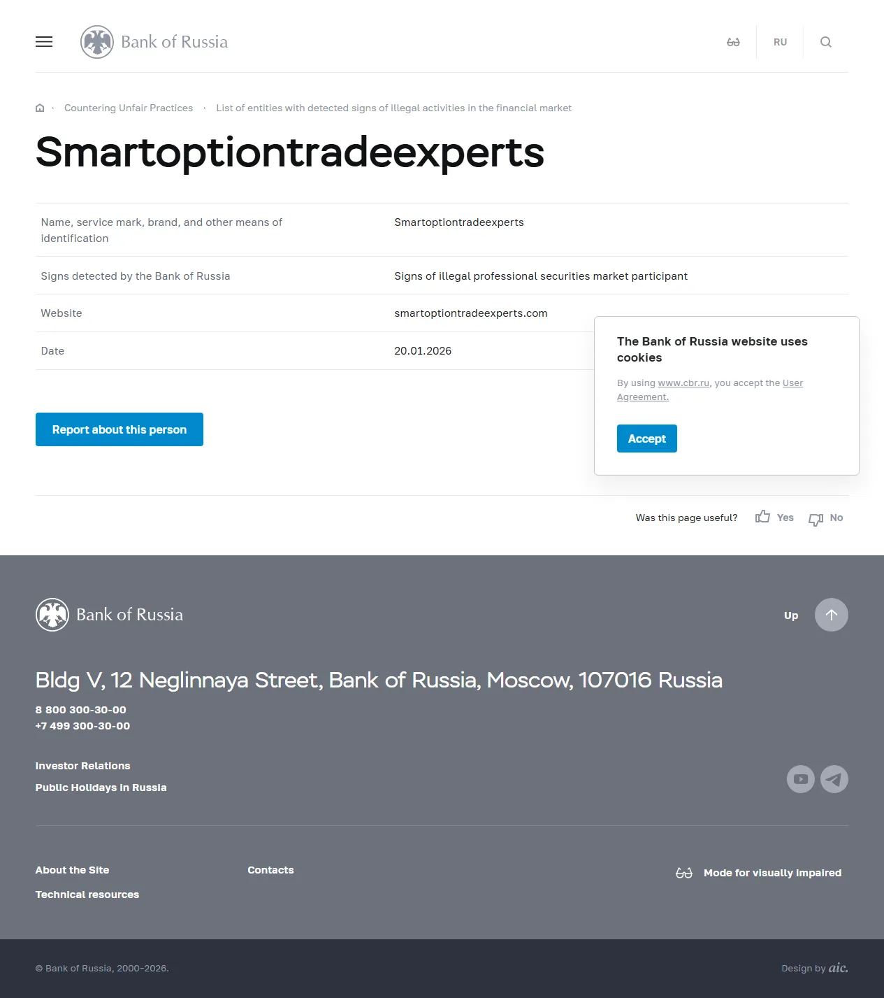 รายชื่อนิติบุคคลที่มีสัญญาณการตรวจพบกิจกรรมผิดกฎหมายในตลาดการเงิน Smartoptiontradeexperts.