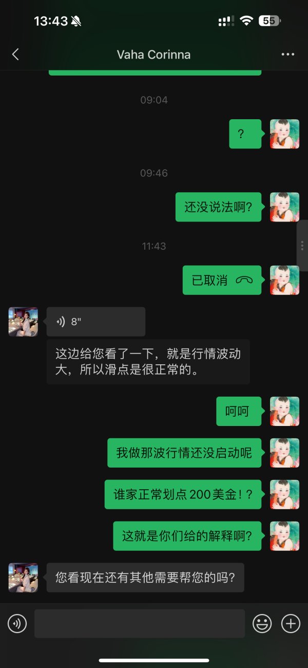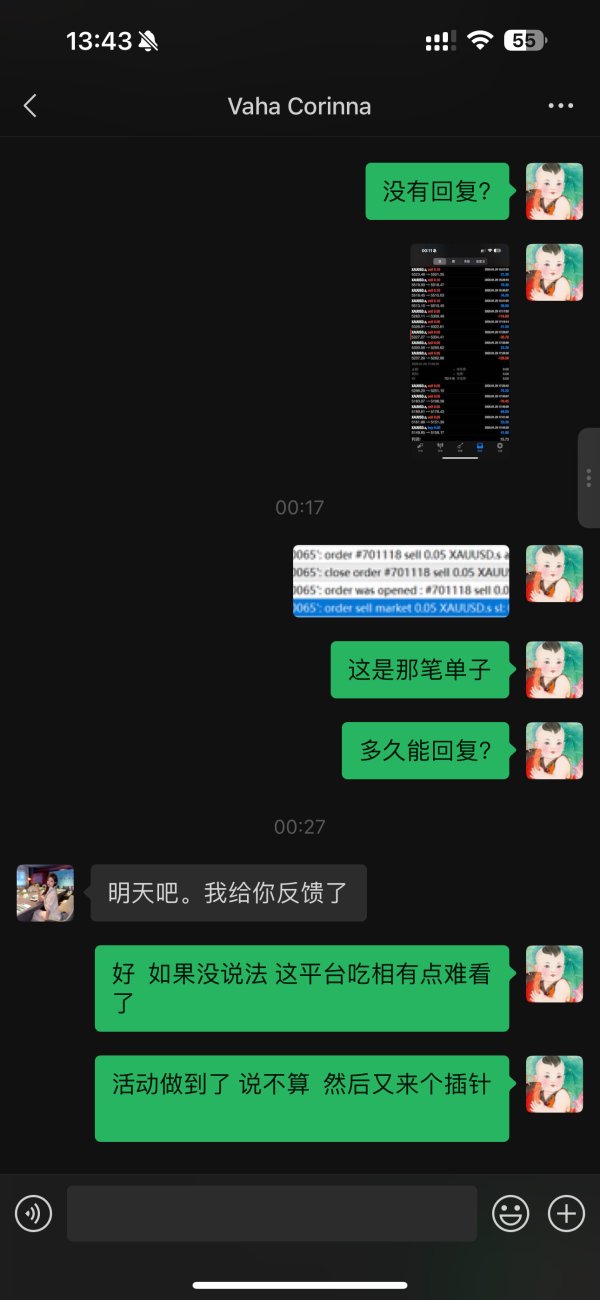 在VAHA和AT平台均有入金开户交易的,但在1月29号时,A某称在VAHA平台的单子发生“插针”情况,没有任何行情的情况下,滑点200点 图一是vaha.图二是at 最可气的是 数据平台方都调不出来 当时在at盈利87美金平仓 在vaha亏128美金 平台方一点回复没有 是不是新平台玩不起 客户盈利就插针