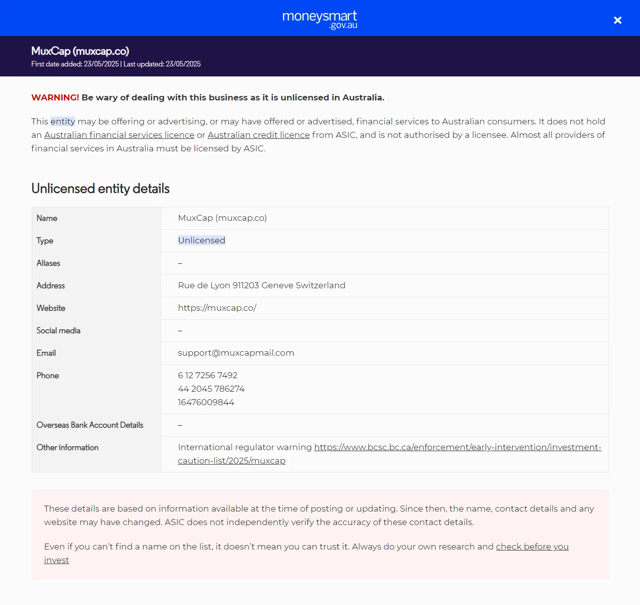 Diğer bilgilerUluslararası düzenleyici uyarıhttps://www.bcsc.bc.ca/enforcement/early-intervention/investment-caution-list/2025/muxcap.
