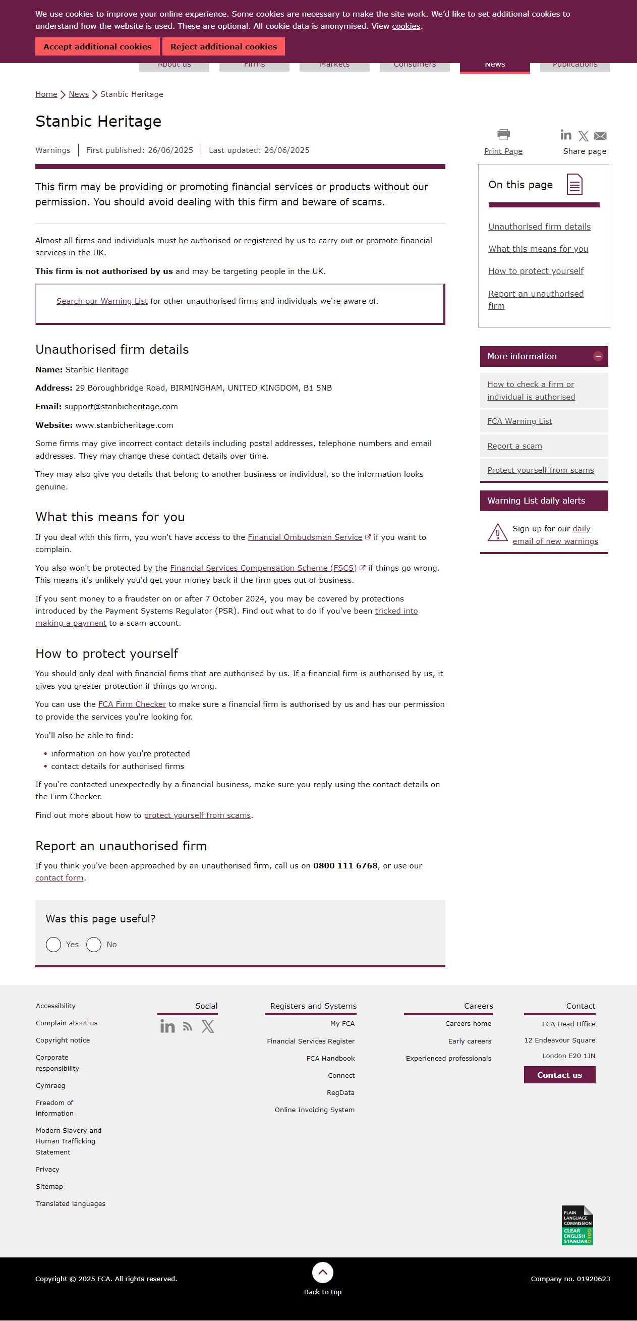 Bu firma, bizim iznimiz olmadan finansal hizmetler veya ürünler sunuyor veya tanıtıyor olabilir. Bu firma ile iş yapmaktan kaçınmalı ve dolandırıcılıklara karşı dikkatli olmalısınız. Birleşik Krallık'ta finansal hizmetler sunmak veya tanıtmak için neredeyse tüm firmaların ve bireylerin bizim tarafımızdan yetkilendirilmiş veya kayıtlı olması gerekir. Bu firma bizim tarafımızdan yetkilendirilmemiştir ve Birleşik Krallık'taki insanları hedef alıyor olabilir. Diğer yetkisiz firmalar ve bireyler için Uyarı Listemizi arayın. Yetkisiz firma detayları Adı: Stanbic Heritage Adres: 29 Boroughbridge Road, BIRMINGHAM, BİRLEŞİK KRALLIK, B1 5NB E-posta: support@stanbicheritage.com Web sitesi: www.stanbicheritage.com Bazı firmalar, posta adresleri, telefon numaraları ve e-posta adresleri dahil olmak üzere yanlış iletişim bilgileri verebilir. Bu iletişim bilgilerini zamanla değiştirebilirler. Ayrıca size başka birine ait bilgiler de verebilirler. işletme veya birey, bu yüzden bilgi gerçek görünüyor.".