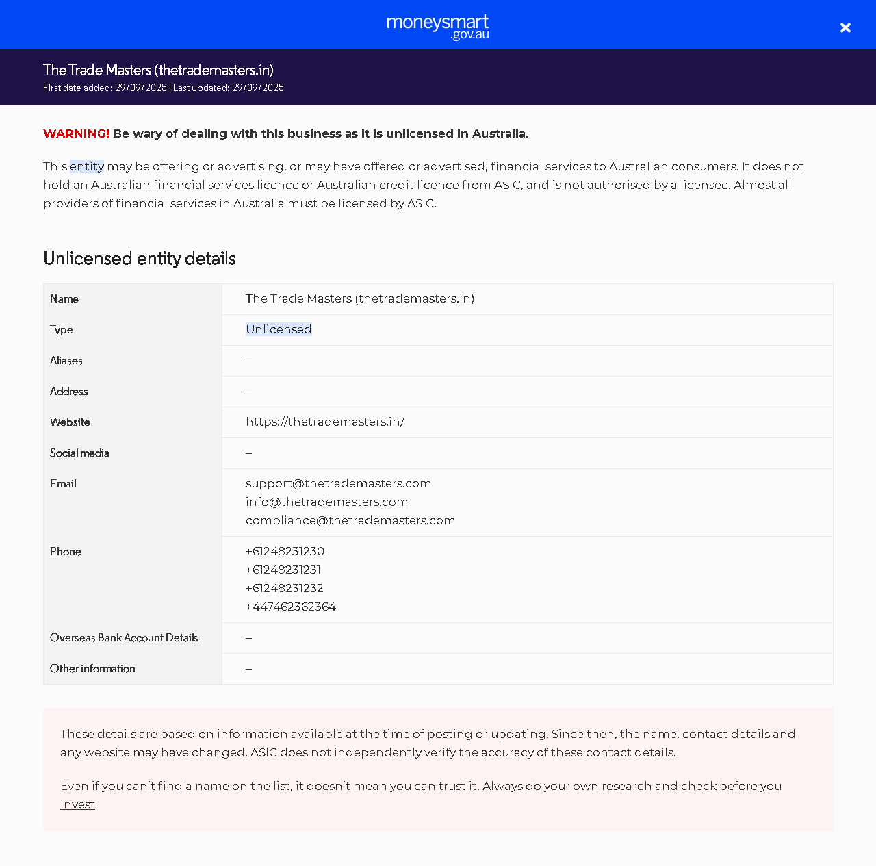 TürLisanssızAvustralya'da insanlara lisanssız olarak finansal hizmetler (finansal ürünler dahil) sunuyor. ASIC'den bir Avustralya finansal hizmetleri (AFS) lisansı veya Avustralya kredi lisansına sahip değiller.