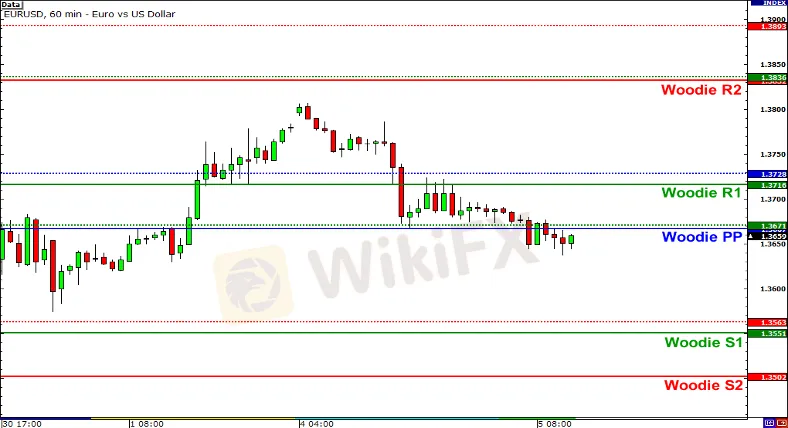 Dưới đây là một ví dụ biểu đồ về cách tính điểm xoay Woodie được áp dụng cho cặp EURUSD.