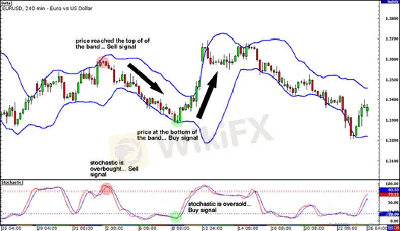 Trong ví dụ đầu tiên này, chúng ta kết hợp các dải Bollinger và Stochastic trên biểu đồ 4H của cặp EUR / USD.