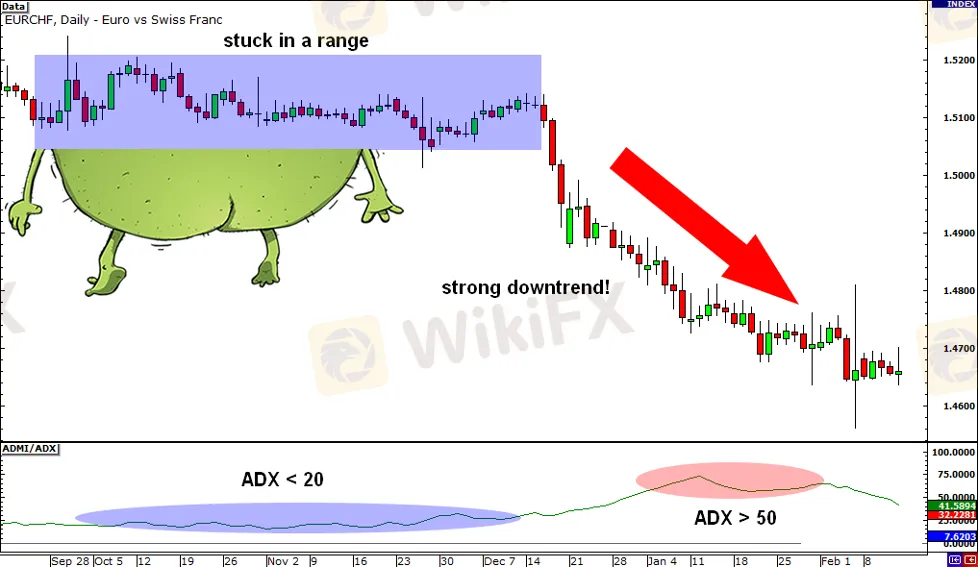Khi chỉ số ADX ở mức thấp, nó đánh dấu các giai đoạn mà giá thường đi ngang hoặc đang giao dịch trong phiên.