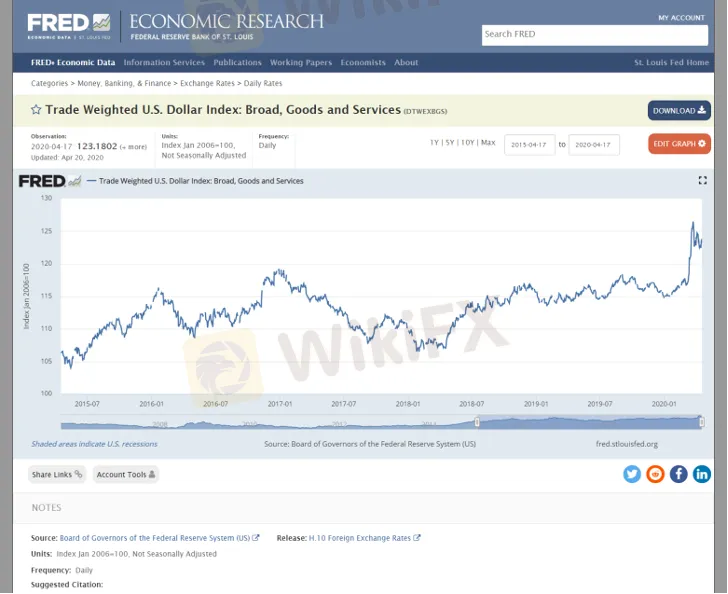 Dưới đây là “trọng số trung bình giá trị ngoại hối của đồng đô la Mỹ so với tiền tệ của một số quốc gia là đối tác thương mại của Mỹ”, được cung cấp bởi Ngân hàng Dự trữ Liên bang St. Louis.