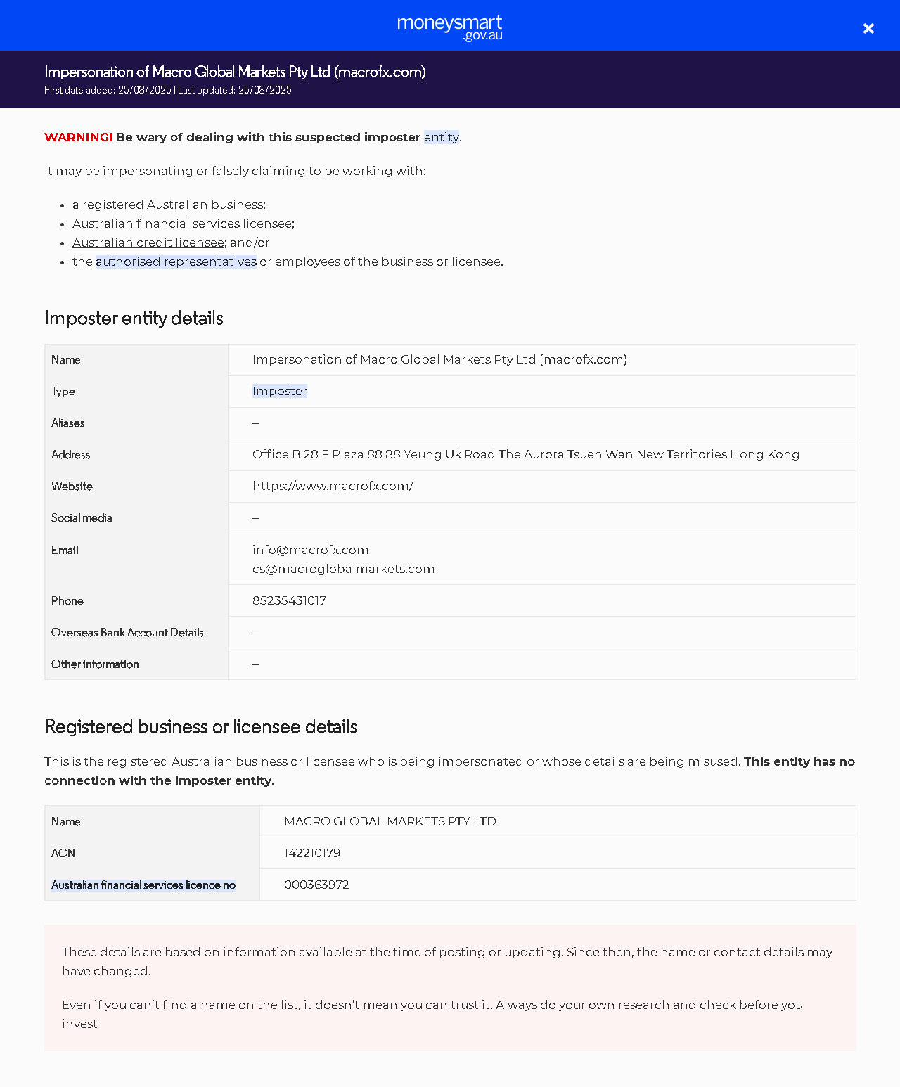 danh sách cảnh báo nhà đầu tưHành vi giả mạo Macro Global Markets Pty Ltd (macrofx.com).