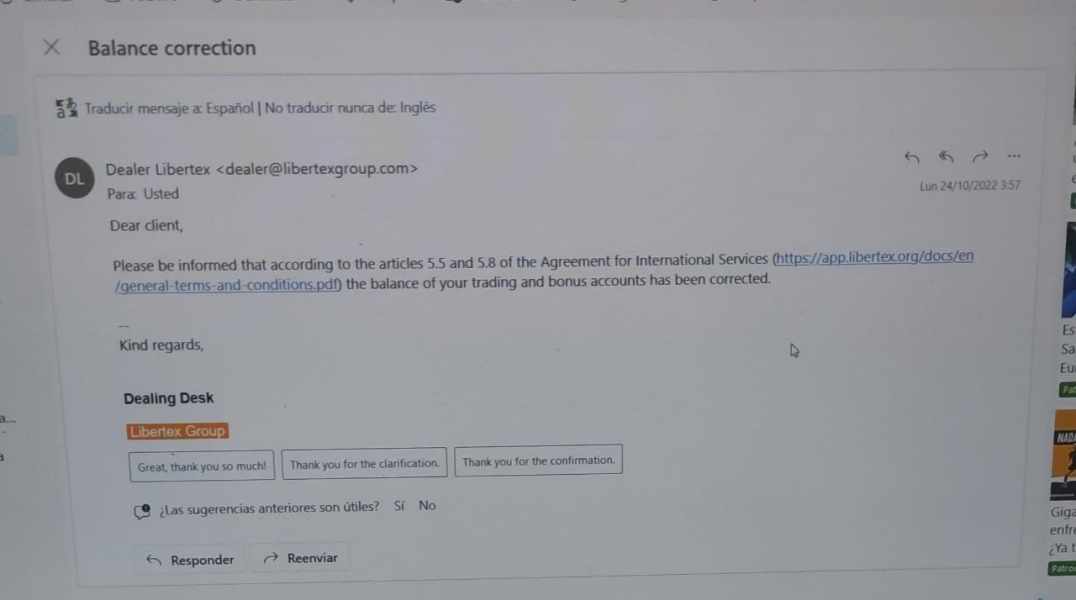 一切正常 Libertex直到他们借了我 5877 美元,我说借了,当我应该说他们抢了我......首先他们不会让我取款好几天,直到他们最终做出他们的欺诈性交易纠正,他们拿走了我的钱并且 6 个月了通过了,他们还没有退还我,我们会逃跑谴责,直到他们关闭经纪人或退还我们的钱……我是 ana patiño,我的账户是 Libertex是:1811510263