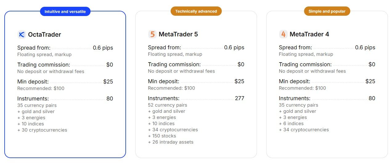 i liked trading with octa on mt 5 account a)no commissions b)tight spreads most of the time c) not big deposit It's very comfortable to do trades there on mt5 because of multiple timeframes see the behaviors of charts. I used some tutorials from mql5 too to set different tools on multiple tiemframes, see price shifts from different tech perspectives it was good overall, no lags, charts performed fast A note: one day support didn't respond as quickly as they did