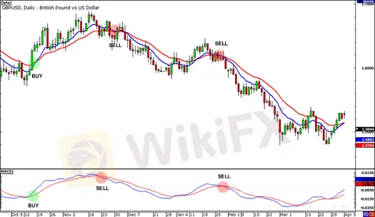 在上面的GBP / USD每日图表上,我们设置了10 EMA(蓝色),20 EMA(红色)和MACD。