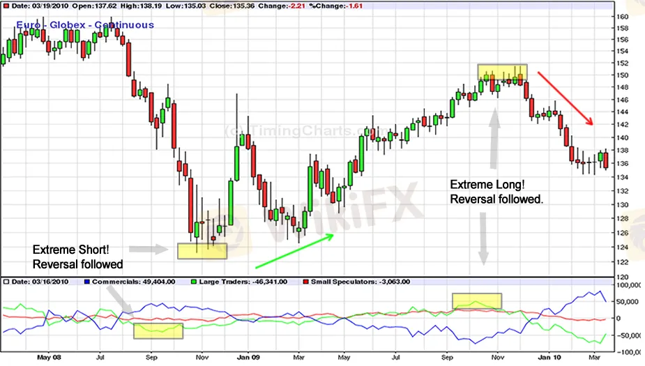 在您的交易中使用COT报告的一种方法是找到极端净多头或净空头头寸。