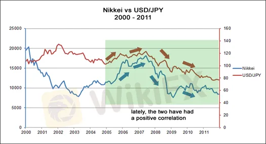相反也成立。每当日经指数下跌时,美元/日元也会上涨。